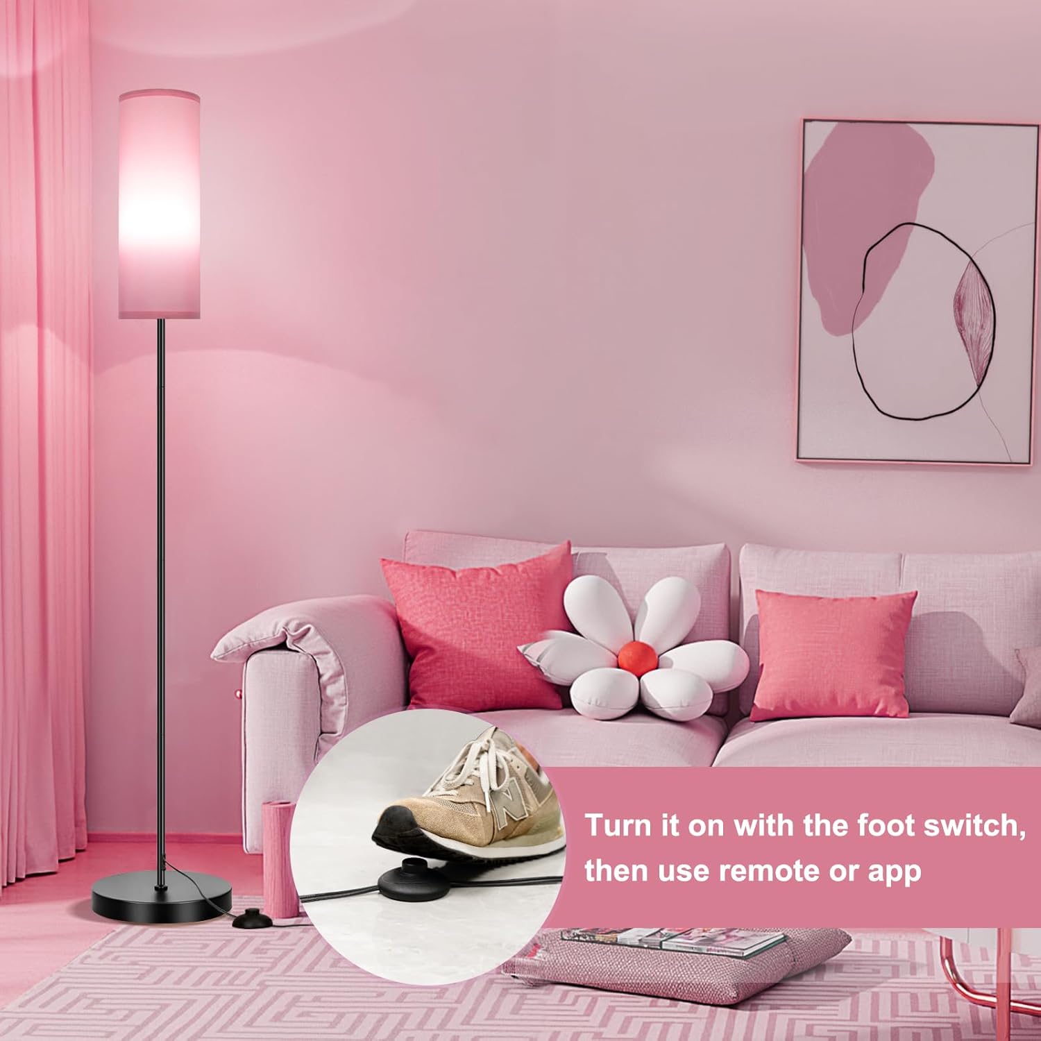 To use the floor lamp, start by turning it on with the foot switch. You can then control it using either a remote or an app. Standing lamp with a music rhythm feature is for the bedroom, playing music through the app, the lamp will change colors&brightness in sync with the beat and rhythm.