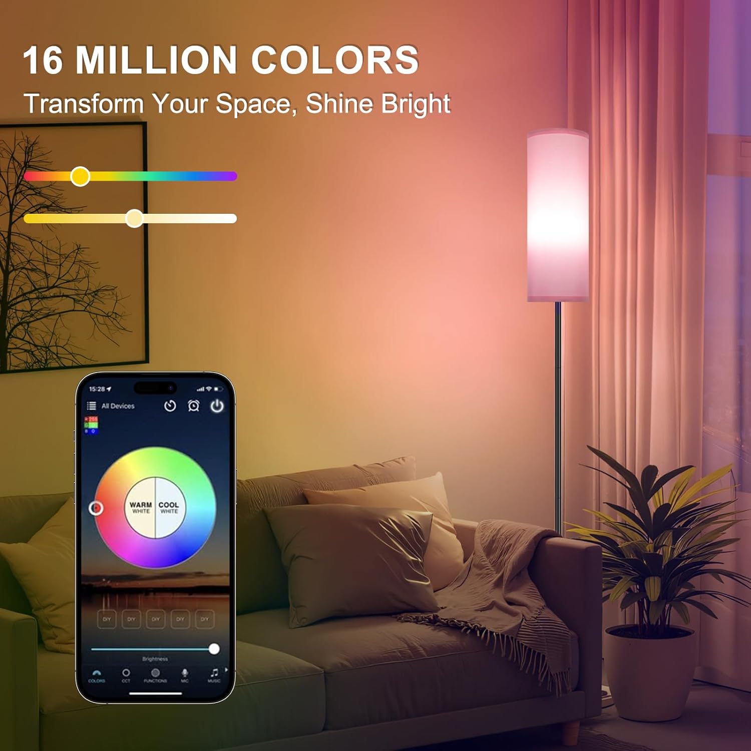 - 【APP Control: DIY& Sync with Music 】You can choose a favorite color and adjust the color temperature using the app. The floor lamp for bedroom also has a music rhythm feature that changes the colors and brightness to match the beat of the music. It's a fun way to liven up your parties with an awesome music and light experience!