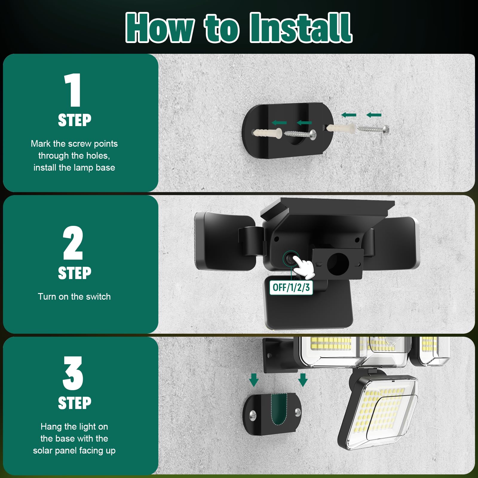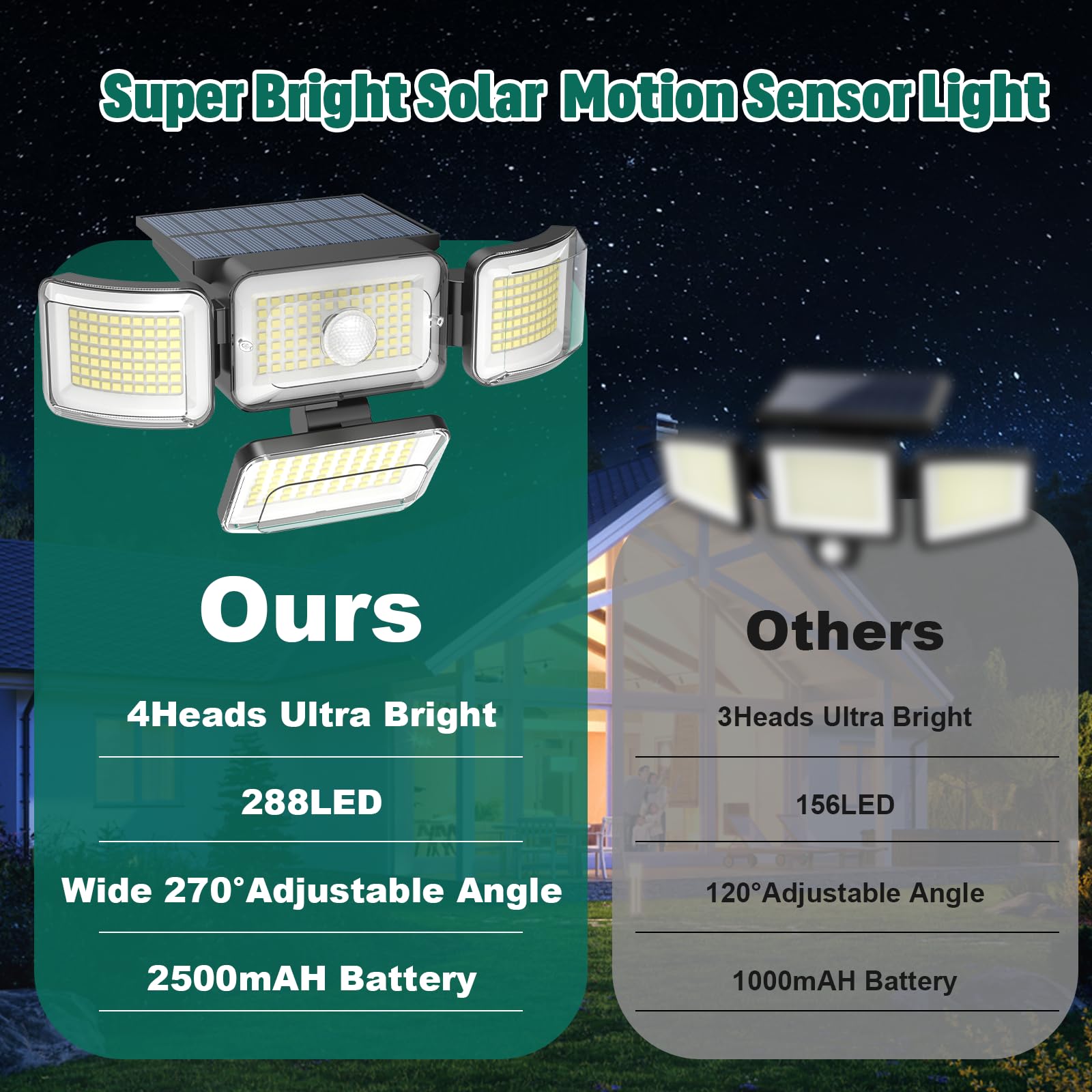 - 【Smart Motion Sensor & 270° wide angle】: Our solar motion sensor lights outdoor are equipped with 4 adjustable light heads and a 270° wide dectection angle which can illuminates a 1600sq ft yard, which provides you with higher brightness and wider coverage.