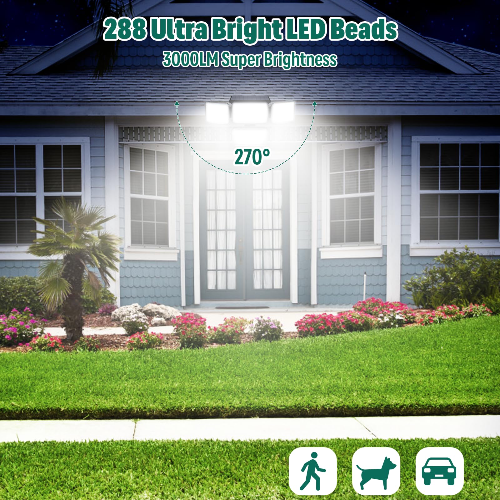 - 【3000LM 288 LED Super Bright】: The solar outdoor lights equipped with 3000LM 288 super bright LED beads which can provide the brightest and most stable light for your patio, garden, garage, yard, fence.