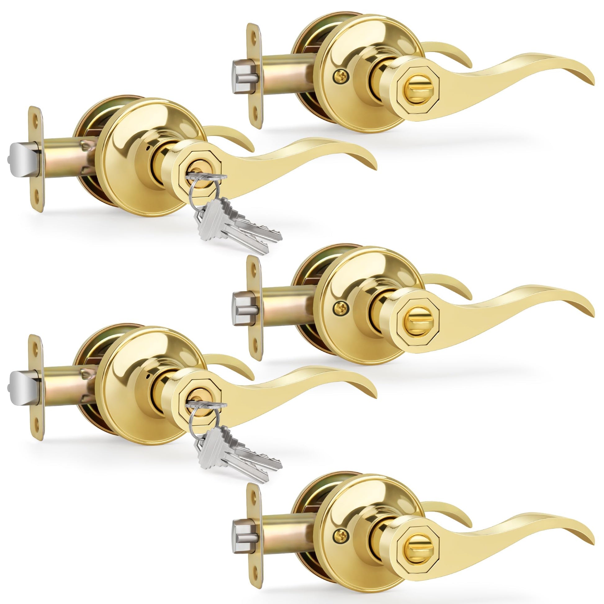 Moquin 5 Pack Wholesale Polished Brass Door Lever, Wave Design Keyed Entry Door Lever with Lock (Keyed-Not-Alike), Reversible Door Handle for Right/Left Side for Front/Entrance Door Lock
