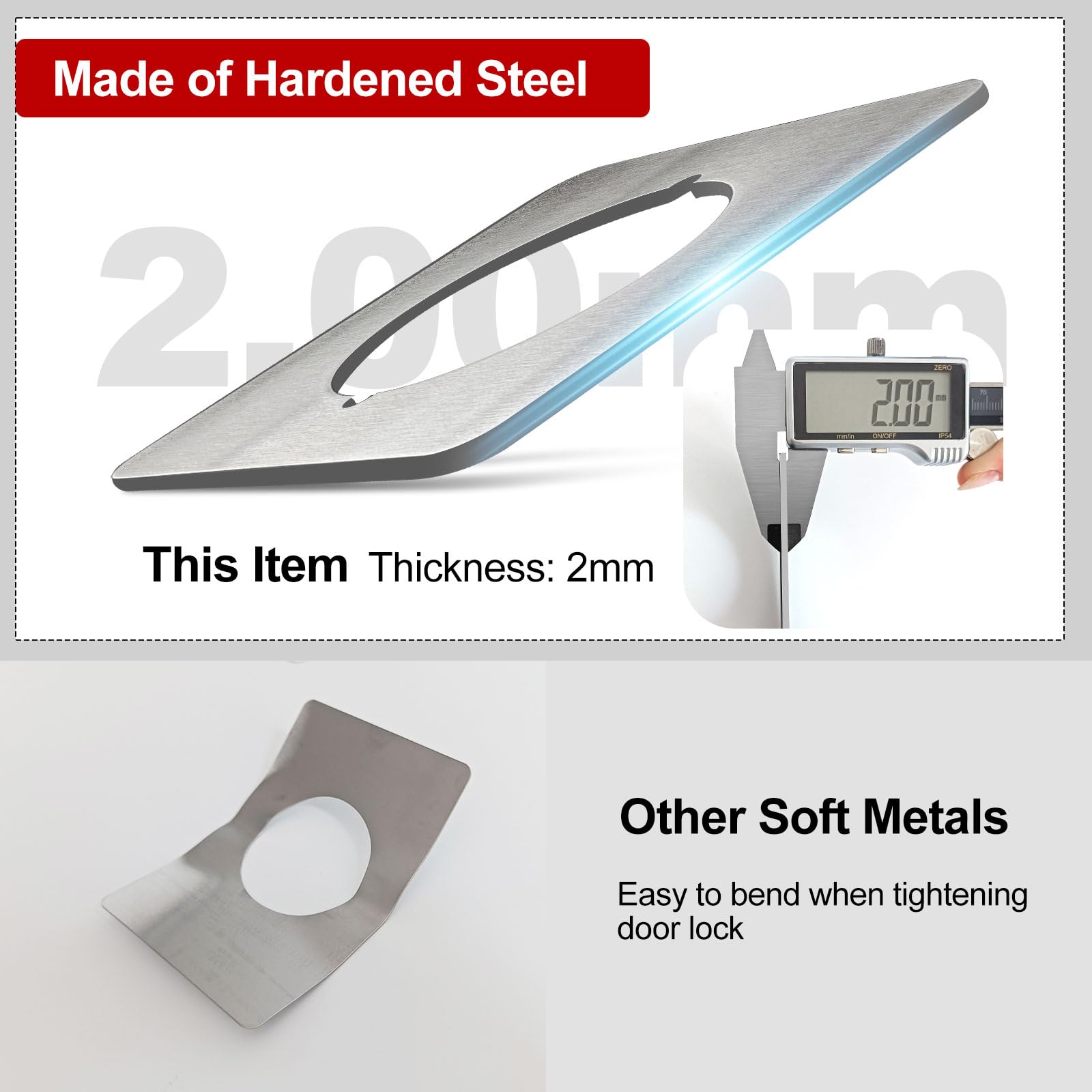 - Features: Made of hardened steel in 2mm thick for better support. Not easily deformed/bent under pressure, especially when over tightening the door lock screws. Edges passivated to prevent hands from being scratched.