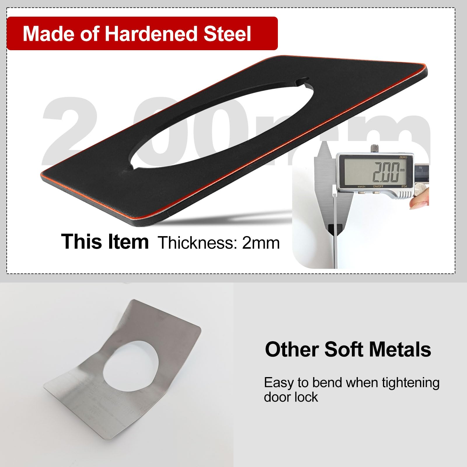- Features: Made of hardened steel in 2mm thick for better support. Not easily deformed/bent under pressure, especially when over tightening the door lock screws. Edges passivated to prevent hands from being scratched.