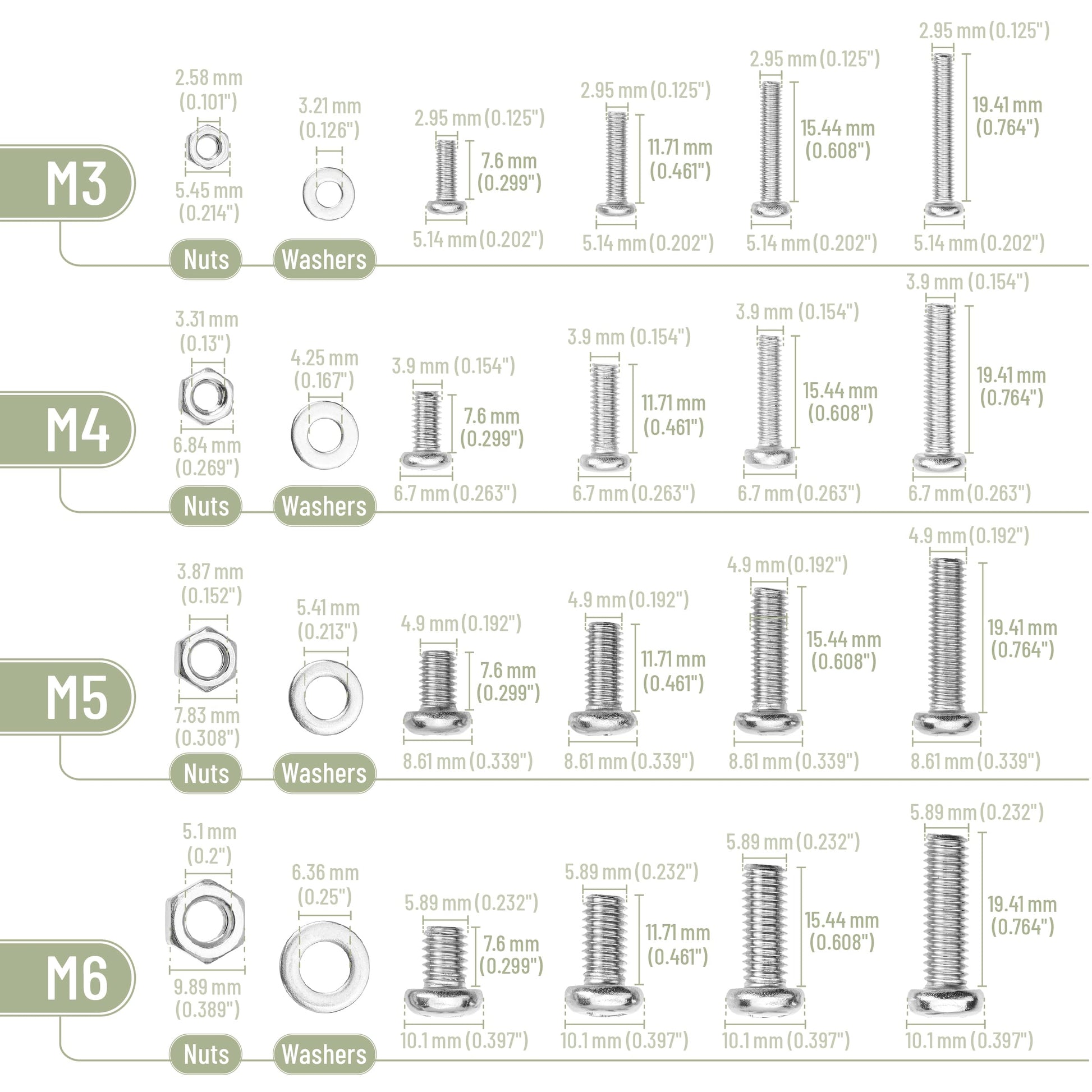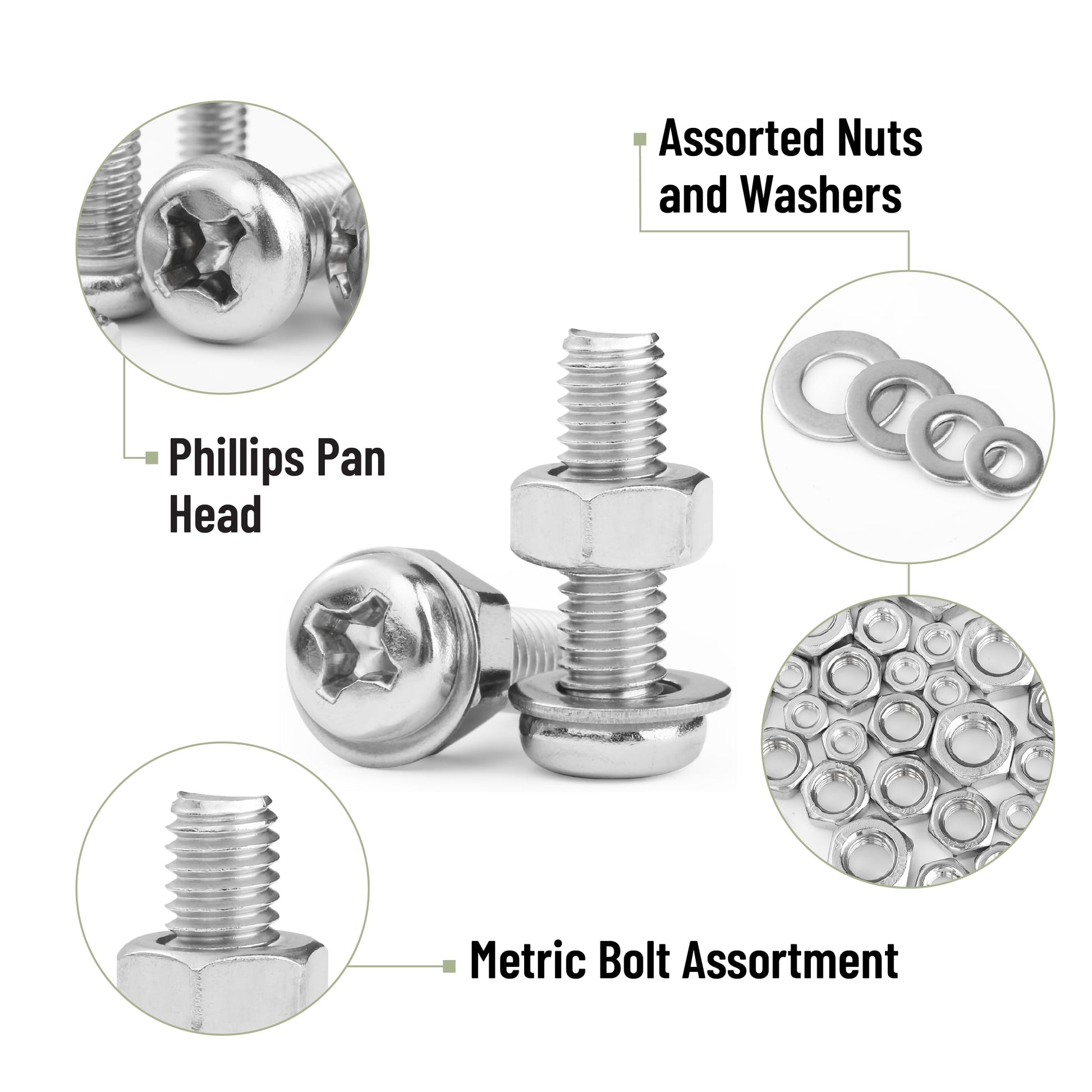 - The kit includes assorted sizes of M3, M4, M5, and M6 Phillips pan head bolts, nuts, and washers to accommodate different fastening needs.