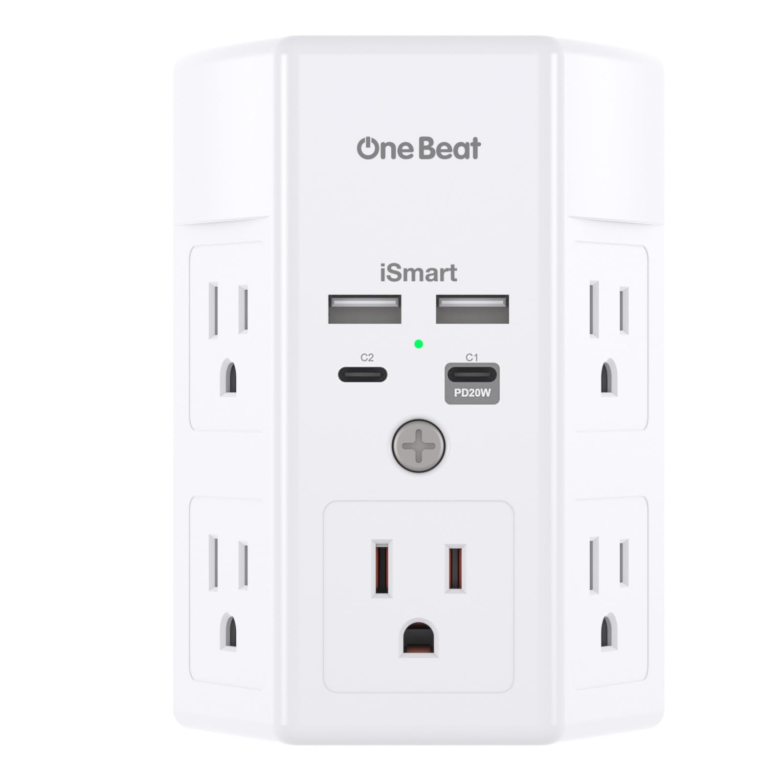 - 【9-in-1 Multi Plug Outlet with Widely Space】 Unique 3 Side Design Power Strip with 5 AC outlets (1875W) and 4 USB ports( 2 USB C PD 20W); One Beat outlet splitter with 2.1 inches long space in between, can charge 5 big plug at the same time without blocking. With built-in 1800 Joules surge protector that meets most of your needs in life, allowing multiple devices to be charged simultaneously.