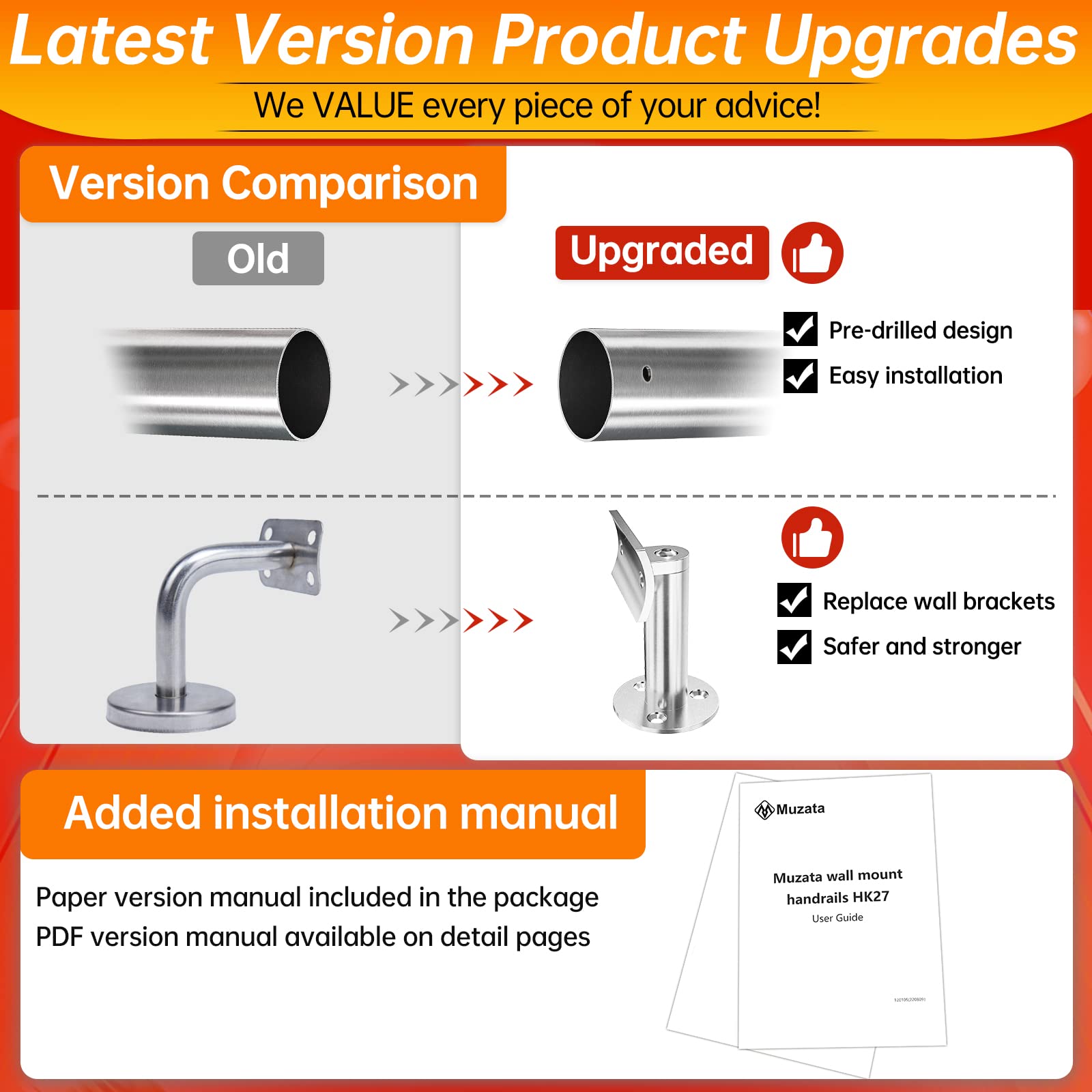 - Various optional :Muzata provides a wide range of stair handrails and accessories to complete your railing project. Please search Muzata HK27 for 3ft, 5ft, 8ft, 10ft, and 12ft round stair handrails, HB01 for wall mounted handrail brackets. If you prefer a rectangular handrail, please search for MUZATA HK28 for 5ft and 10ft options