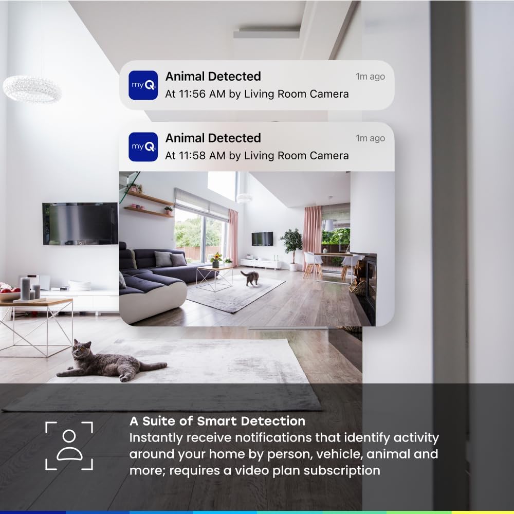 - Live events and motion alerts included: Get up to 30 days of video storage, package and person alerts, and more with a myQ Video Monitoring subscription