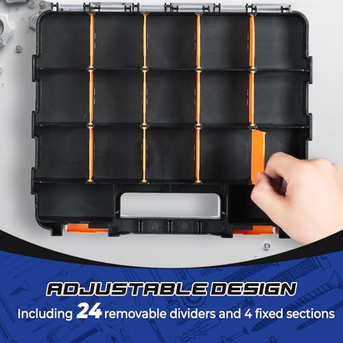 - 34 Customizable Compartments: Designed with 34 total compartments?including 24 removable dividers and 4 fixed sections?this double-sided organizer lets you easily adjust the layout to fit screws, bolts, nails, nuts, beads, jewelry, craft supplies, and more.