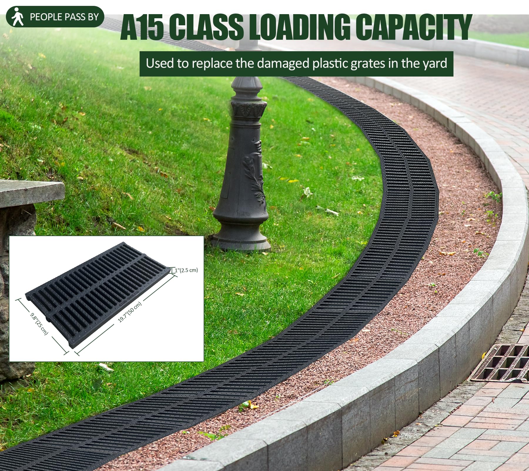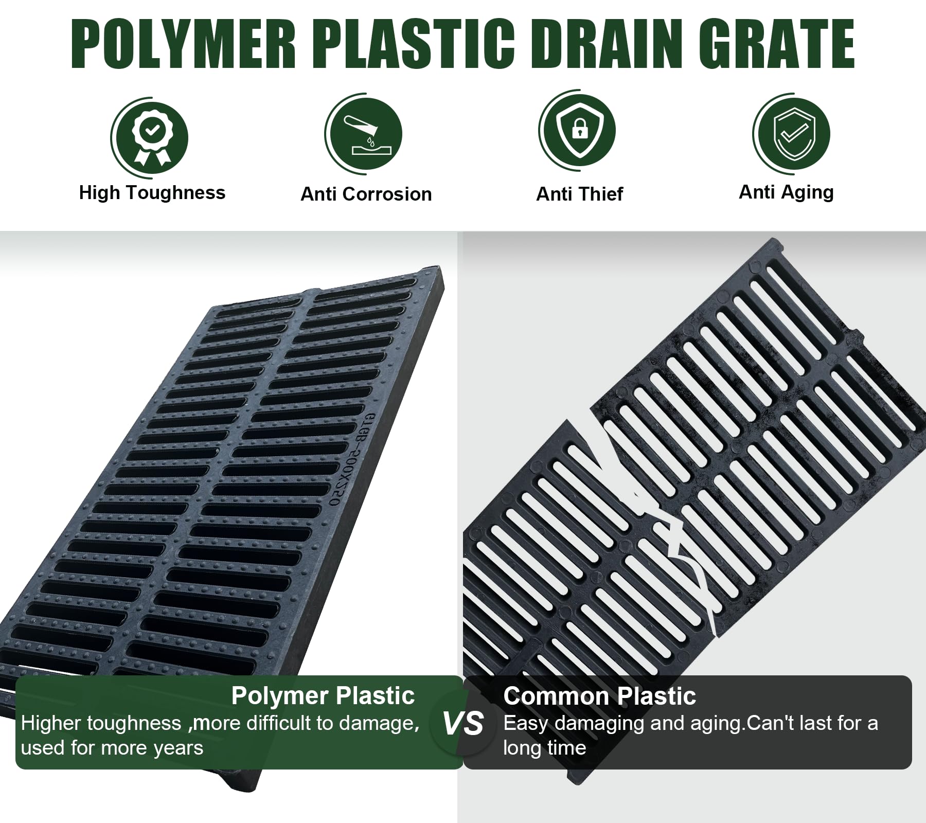 - POLYMER PLASTIC DRAIN GRATE: This trench grate is made of Polymer plastic, which has higher strength and longer service life than common plastic. Besides, it has higher toughness.Durable and sturdy enough. Don't worry about getting damaged when people pass by. Can be used for years.