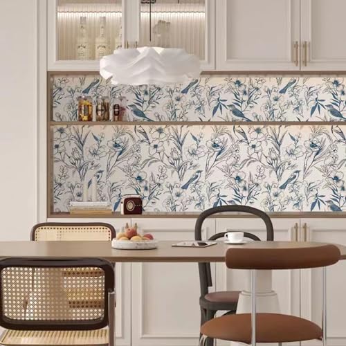 Navy Blue Floral Birds Peel and Stick Wallpaper Rustic Country Birds Floral Shelf Liner Contact Paper for Walls Bedroom Kitchen Bathroom Cabinets Dresser Drawer Furniture Decal 17.7X117 Inches