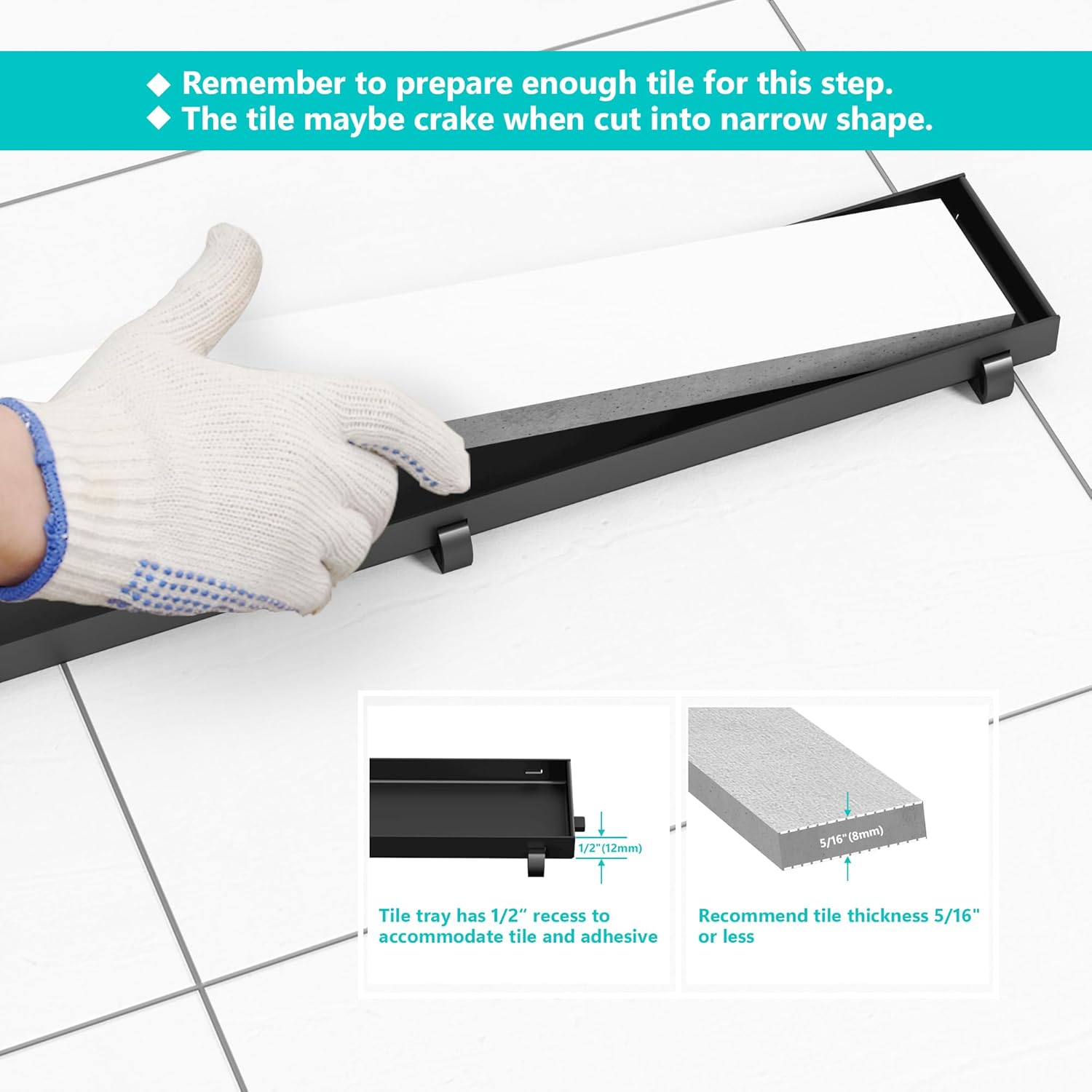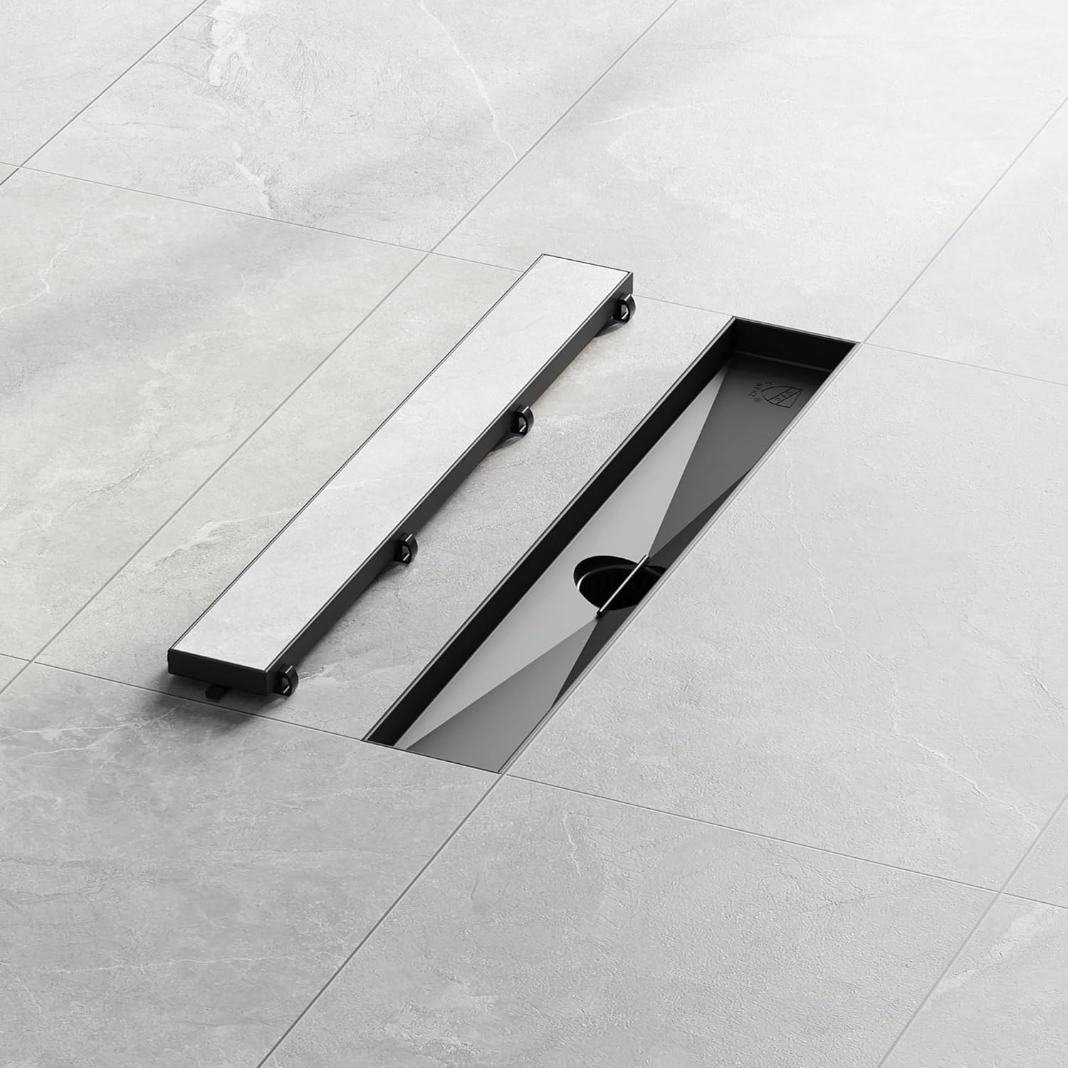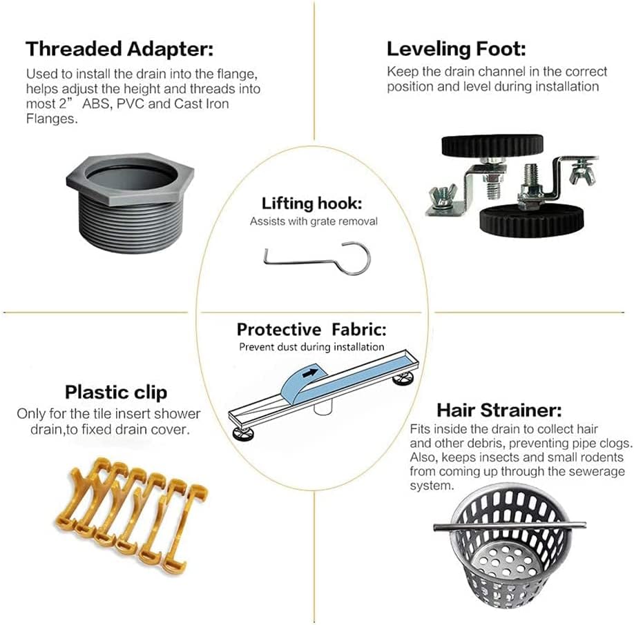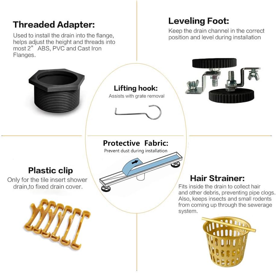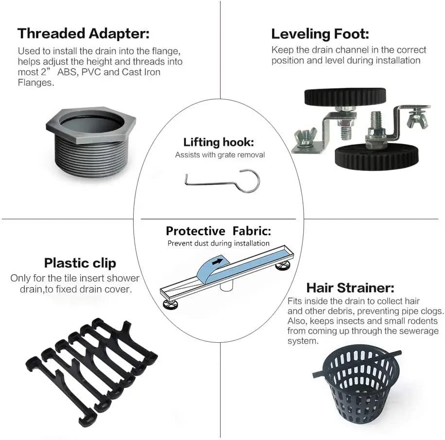 - √ Easy Adjustment: Easy adjustable leveling feet support the channel body during installation. A removable grate makes it easy to clean; The Linear shower drain is the invisible looking design,you can insert any cutted tile on the top of the grate by yourself