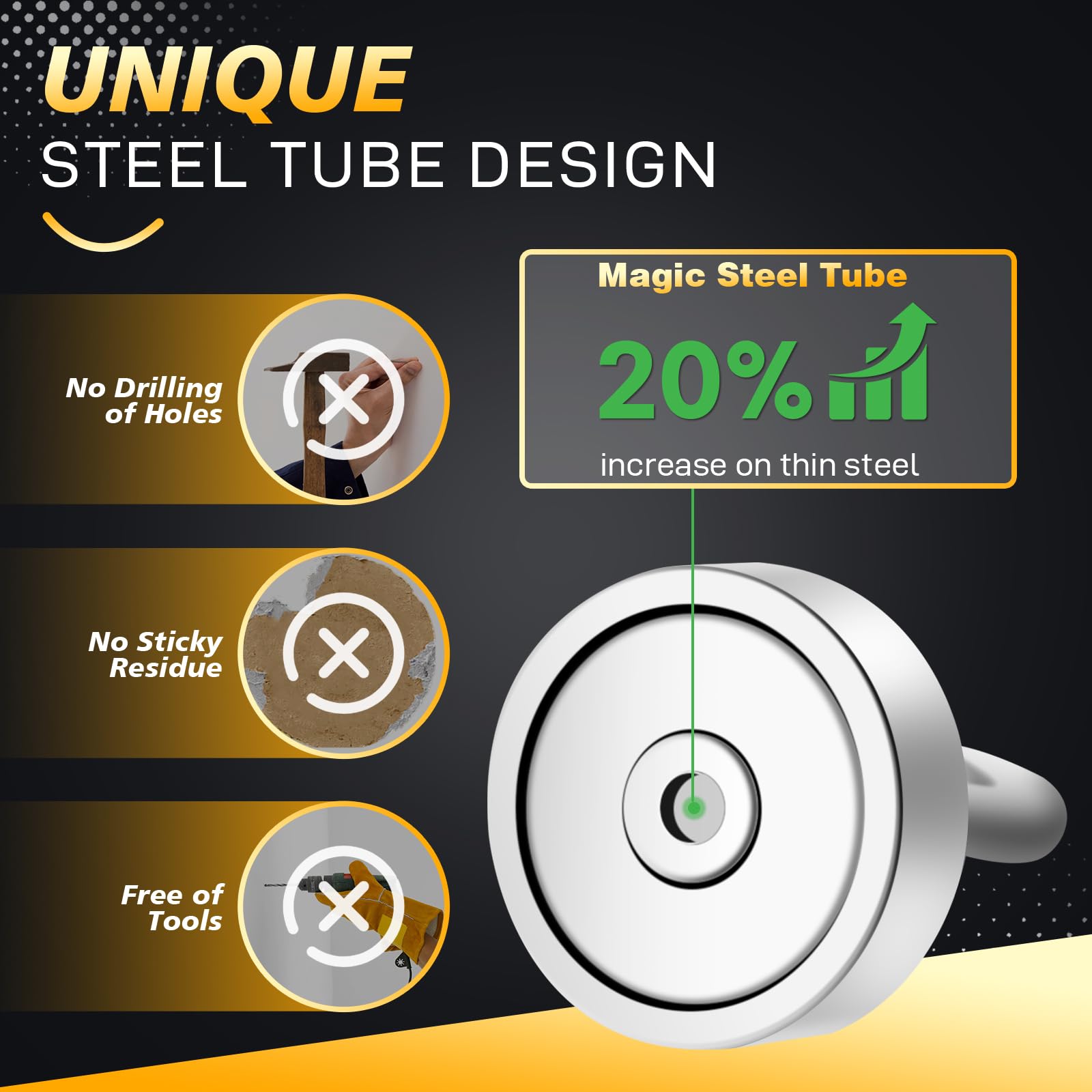 - ✔MAGIC STEEL TUBE DESIGN - Unique design of steel tube inside the base of magnetic hooks greatly increases the attractive force , especially on thin steel! It increase approximately 20% force comparing those none-tube magnets. it solves the problem of weak force on thin steel. Permanent magnetic hook with magic steel tube, strong magnetism lasts forever!