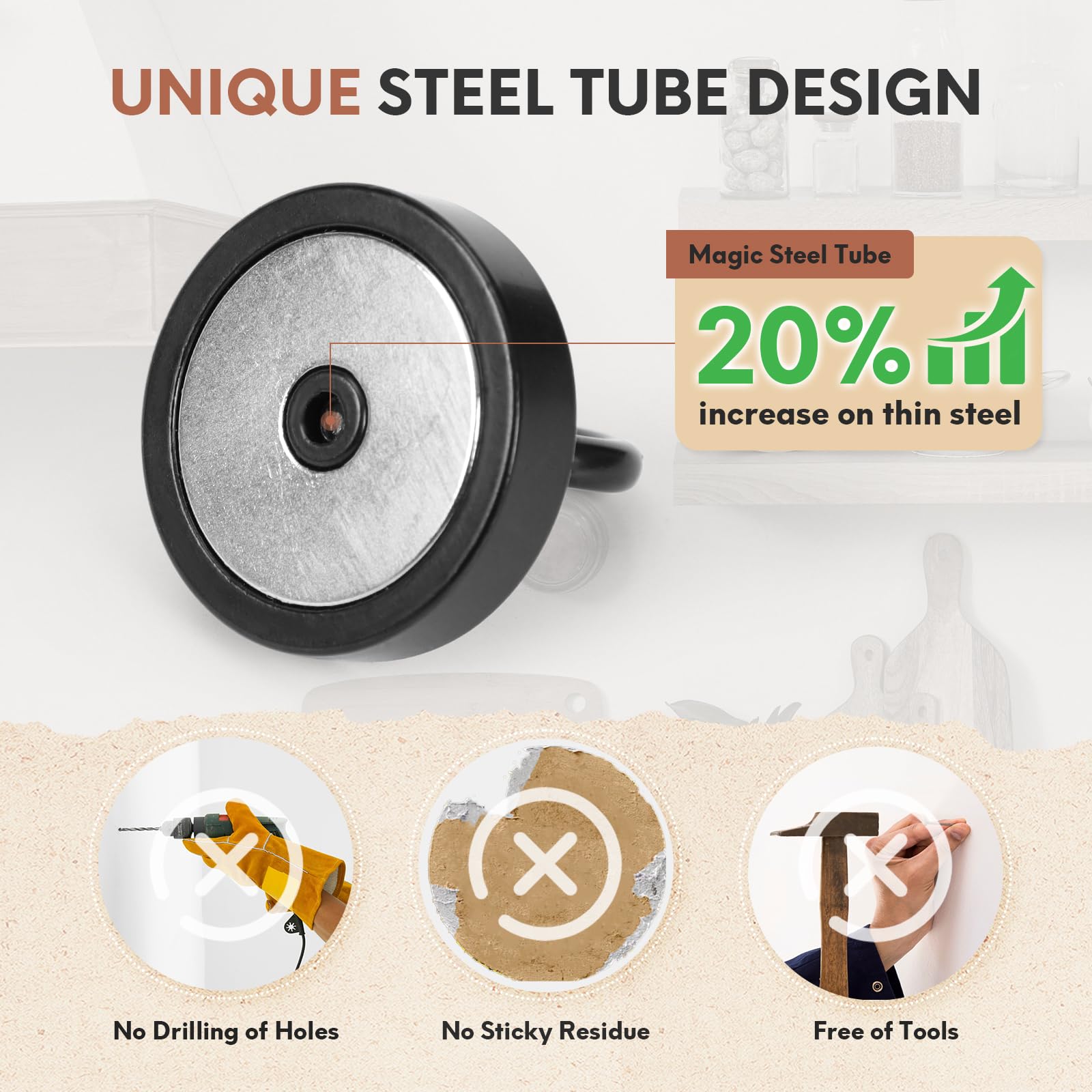 - ✔MAGIC STEEL TUBE DESIGN - Unique design of steel tube inside the base of magnetic hooks greatly increases the attractive force , especially on thin steel! It increase approximately 20% force comparing those none-tube magnets. it solves the problem of weak force on thin steel. Permanent magnetic hook with magic steel tube, strong magnetism lasts forever!