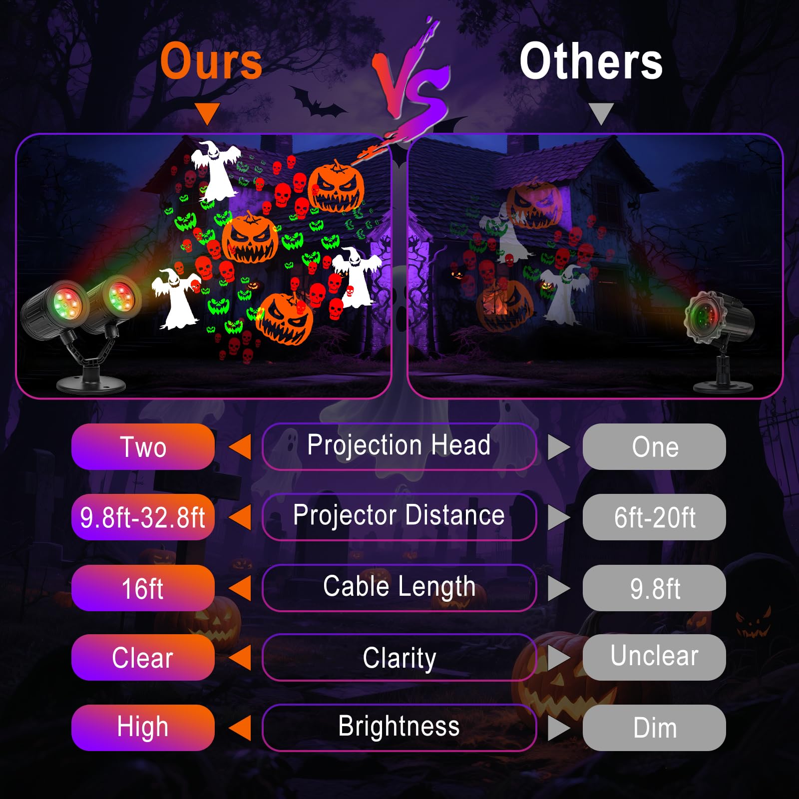 - 【Double Head and 360° Horizontal Rotation】Our Halloween lights projector features a dual-head design and 360° horizontal rotation function, which can expand the projector range and create a tense and scary Halloween atmosphere. For optimal image quality, it is recommended to place the projector between 16.4 feet and 32.8 feet away from the projector surface.