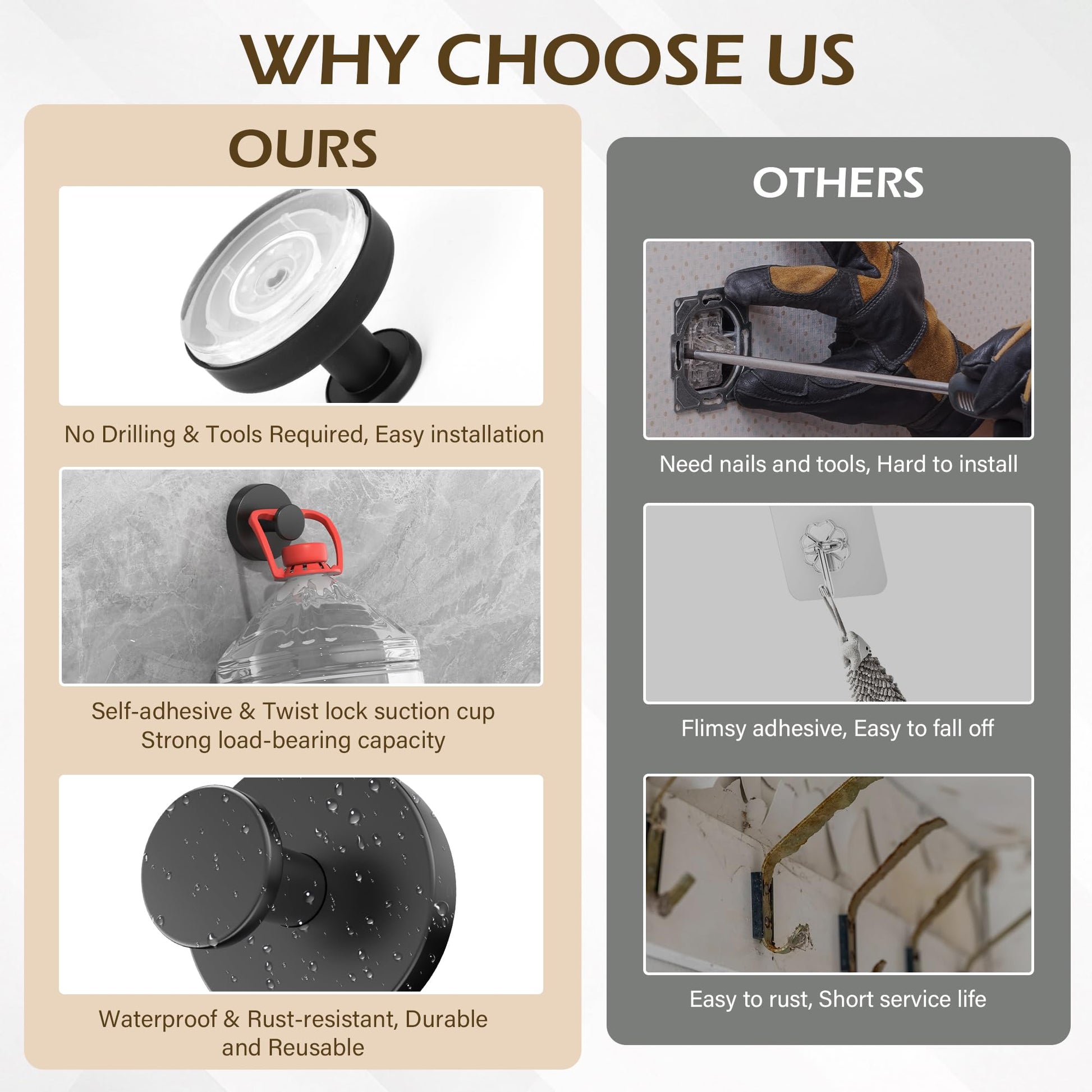 - Strong & Secure Hold: Heavy-duty suction cups with 360° airtight seal, just turn the knob clockwise to squeeze air out and firmly locked to the surface, supporting up to 11lbs per hook. Perfect for towels, robes, loofahs, coats and shower accessories.