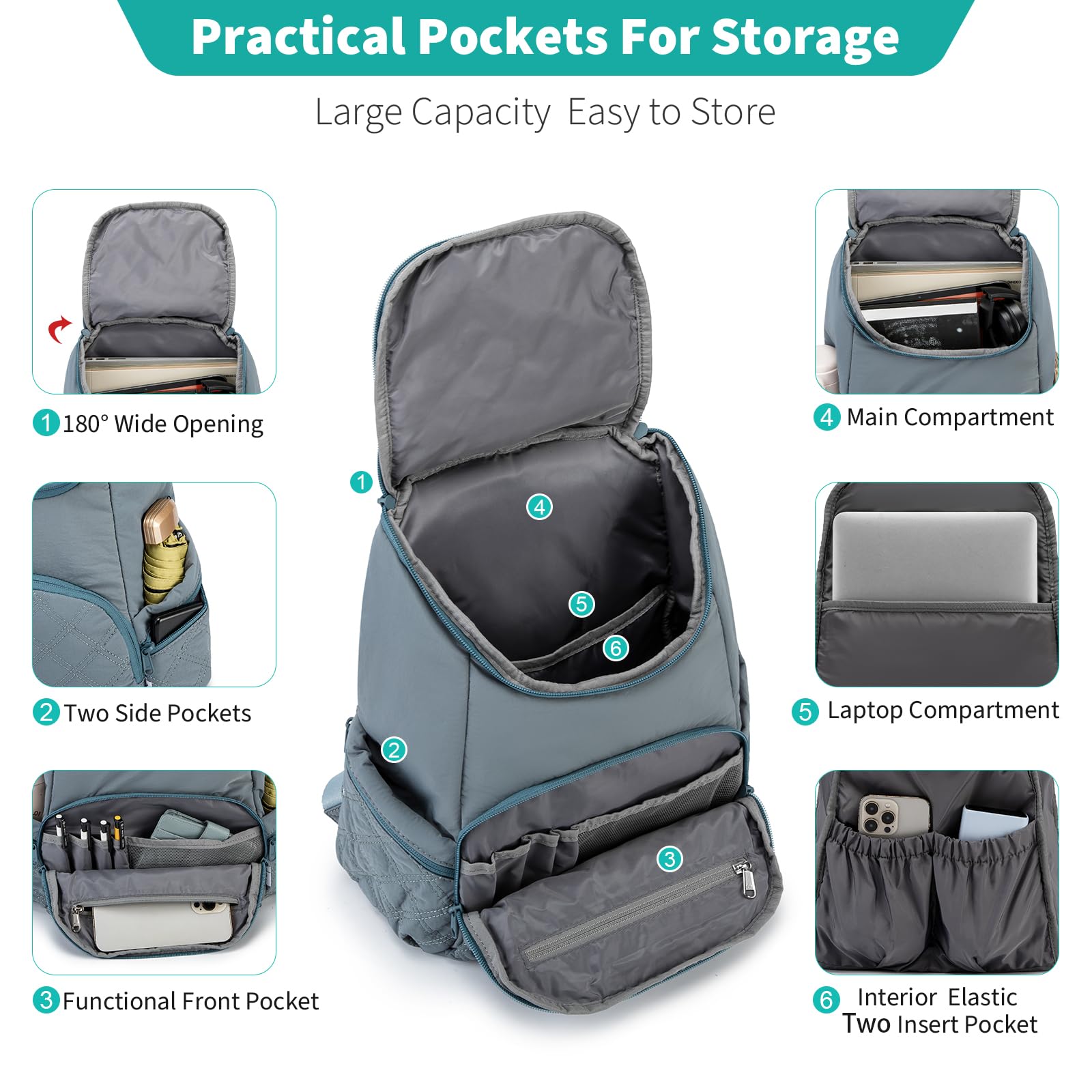 NOL Natural Organic Lifestyle Women's Quilted Puffer Backpack, Large Waterproof Lightweight Puffy Bookbag, Carry on Daypack for Travel, Work (Dusty blue)