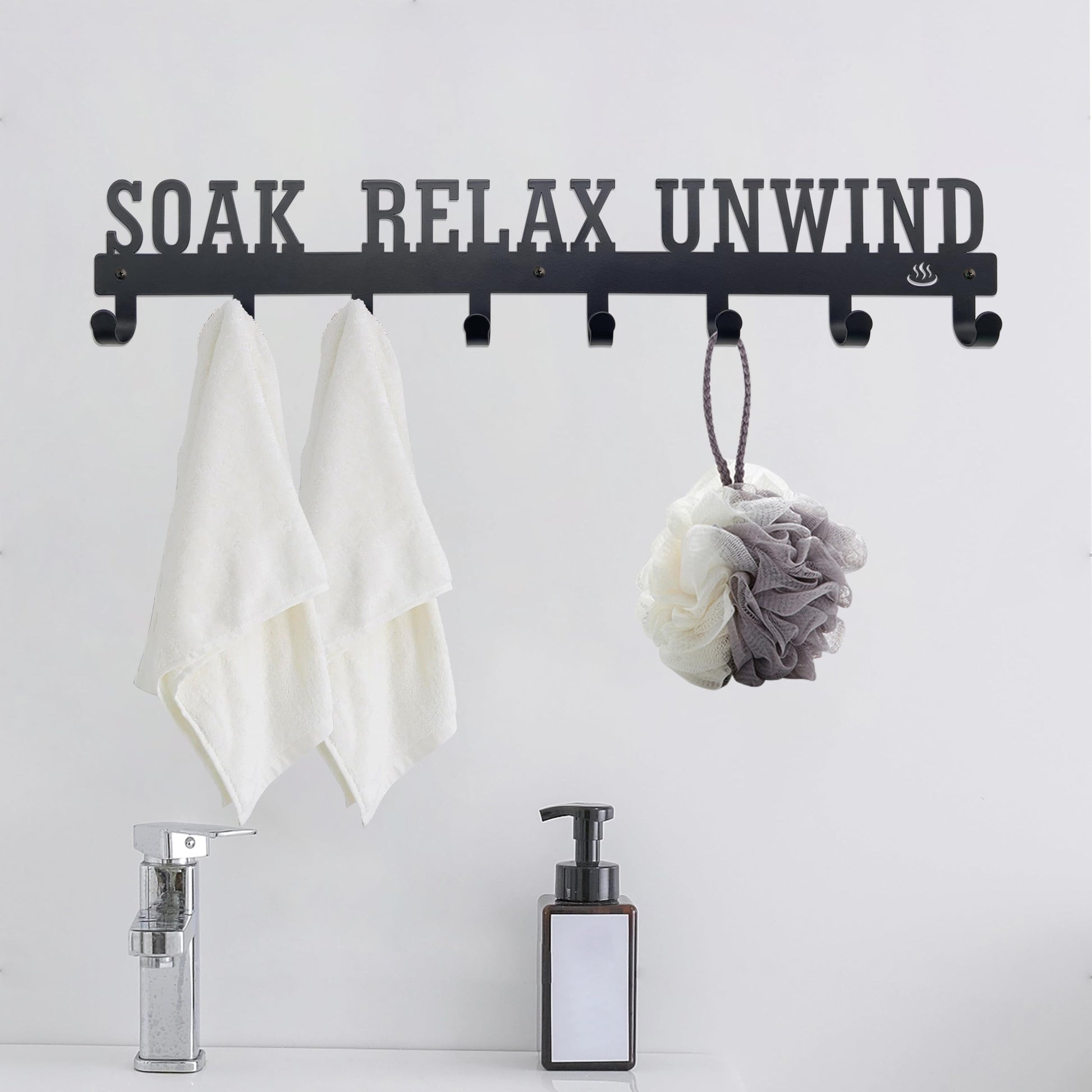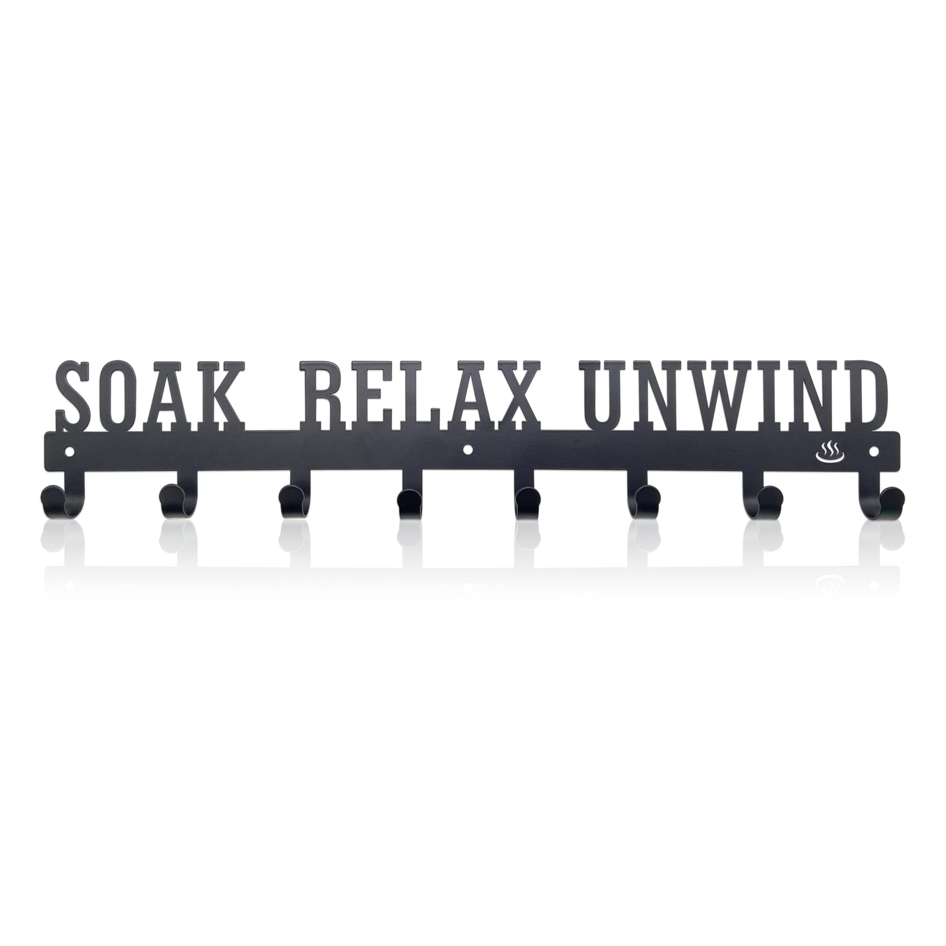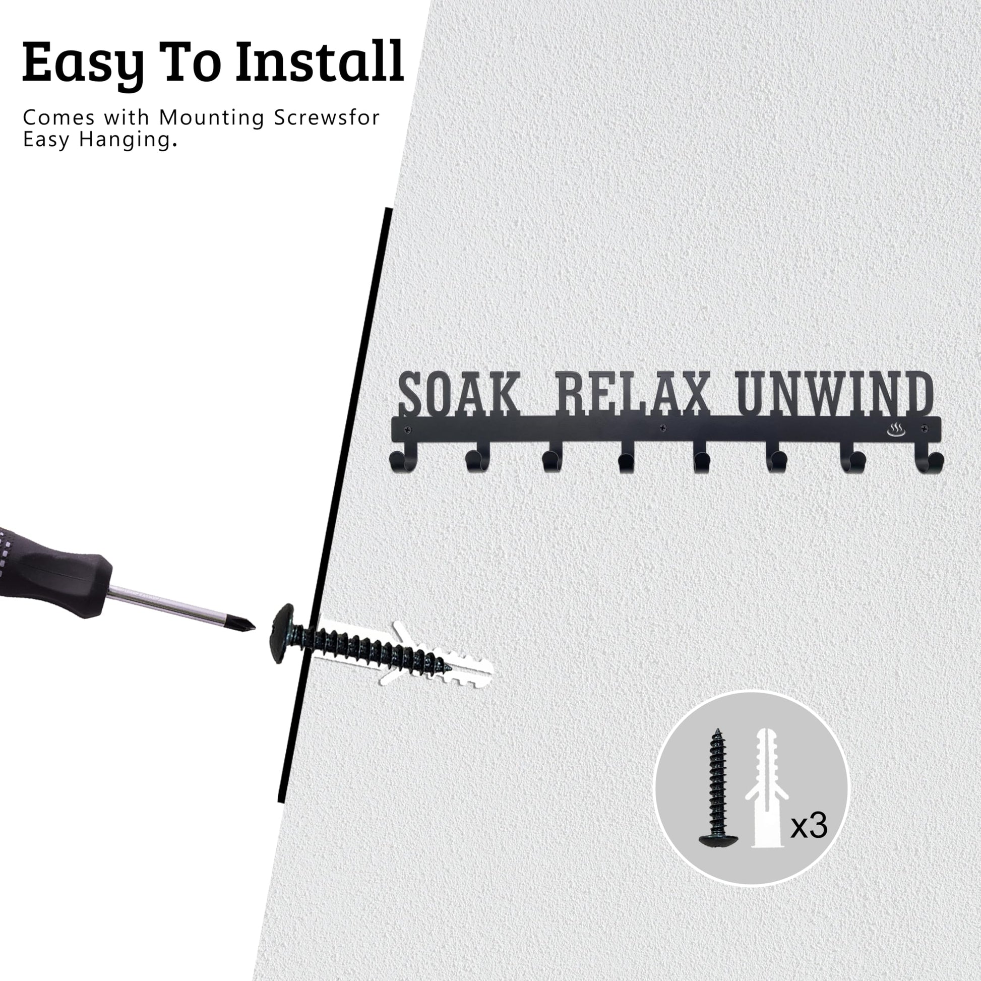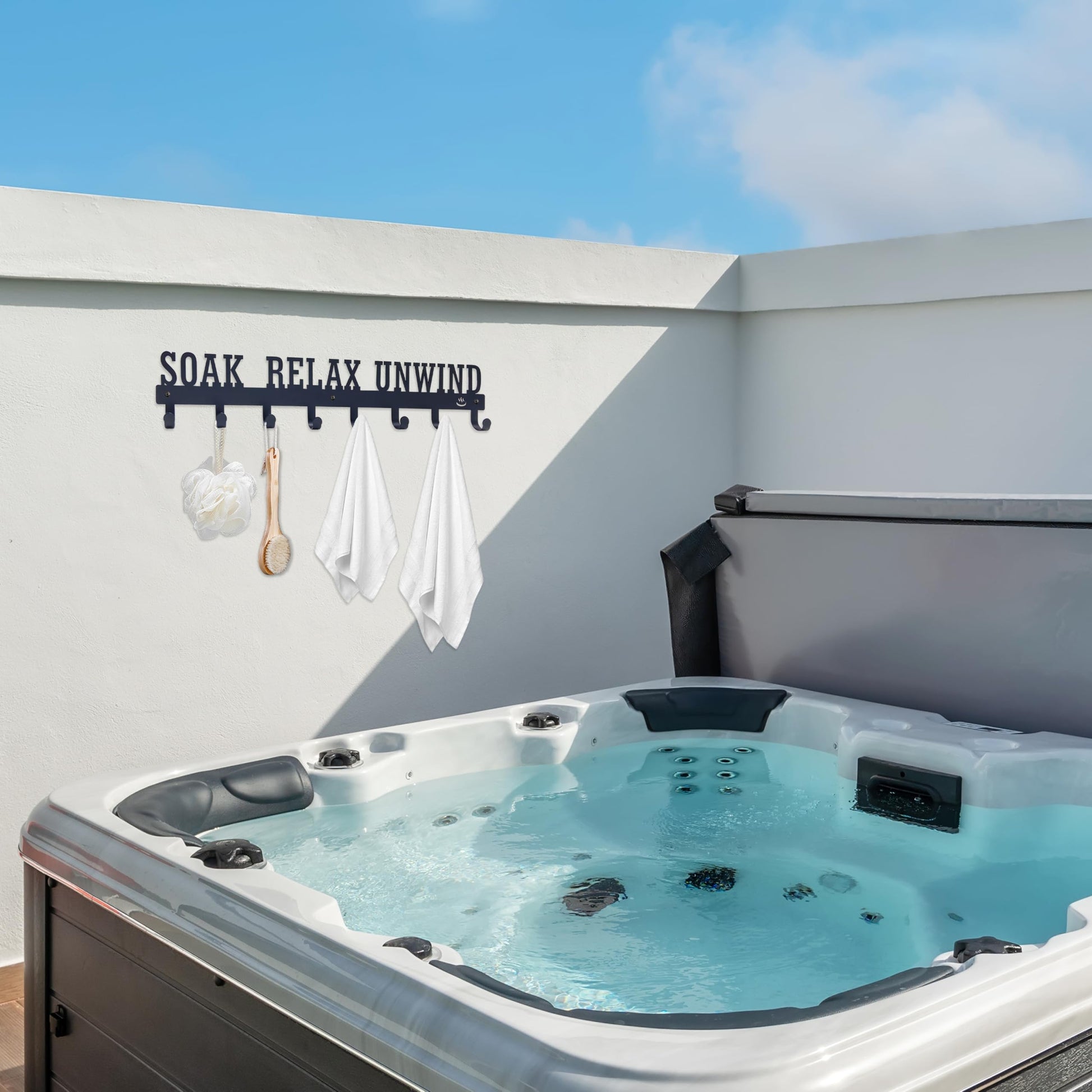 "Presenting our chic and versatile towel organizer for the perfect home spa experience. Designed for indoor and outdoor use, this hot tub towel rack aligns with your bathroom decor sets effortlessly, adding a touch of modern elegance. Its evenly painted surface and the calming 'SOAK RELAX UNWIND' text design infuse your hot tub environment with a serene ambiance. Built with durable metal, it's robust enough to hold large towels and various hot tub accessories without warping, even withstanding prolonged exposure to sunlight. The eight hooks, spanning across 16.5 inches, offer ample room for different item types. And you won't have to worry about installation - the package includes all the necessary hardware, and you can set it up in just 3-5 minutes. Encased in solid packaging, it's ideal for gifting to your hot tub enthusiast friends, as well as a lovely gift option for family and friends. Embrace this must-have hot tub accessory and create your tranquil retreat."
