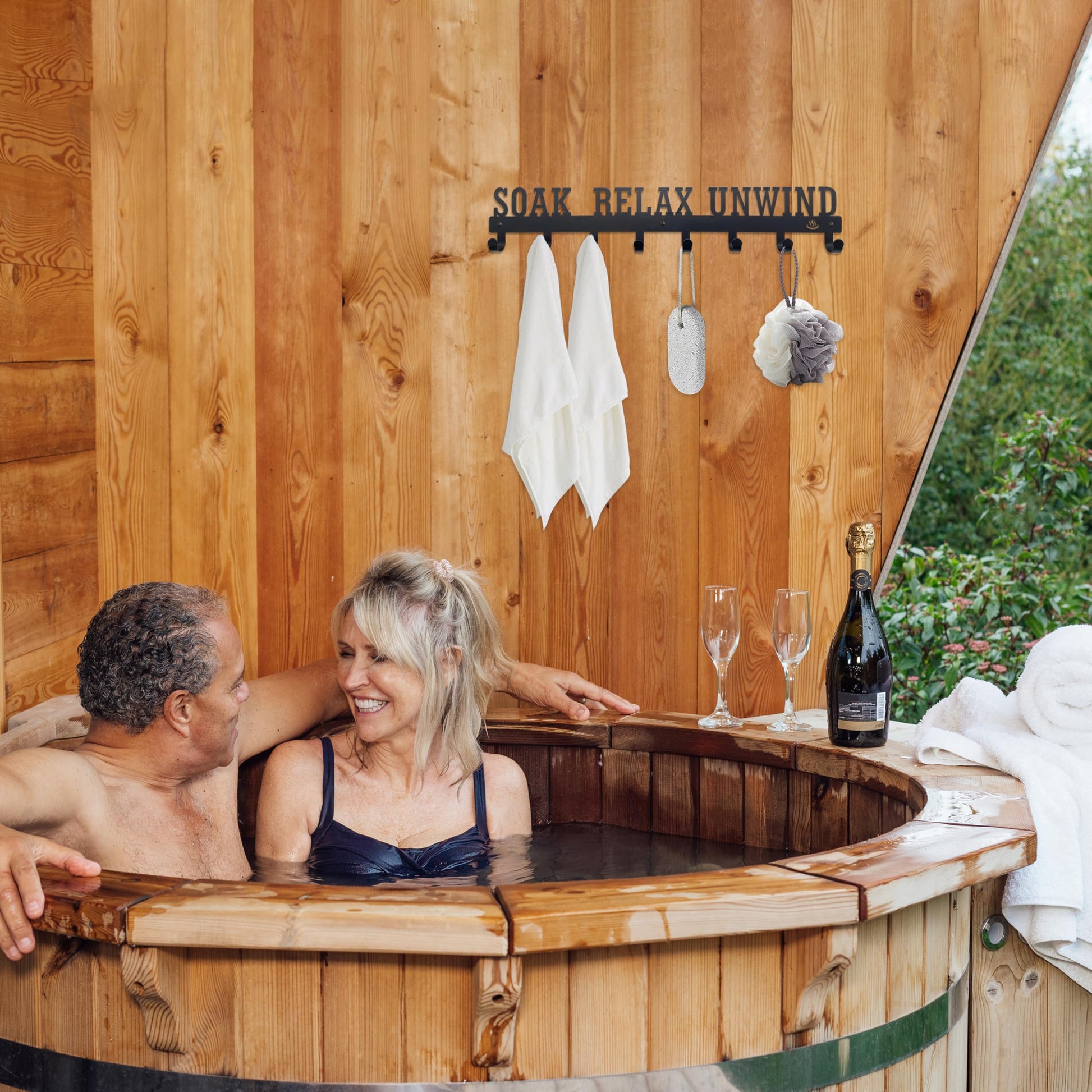 - Contemporary Design: Our hot tub towel rack exhibits a stylish and minimalistic design, ideal for both indoor and outdoor hot tub locations. It features an evenly painted surface and a thoughtfully crafted "SOAK RELAX UNWIND" textual design, fostering a comforting and relaxed atmosphere.