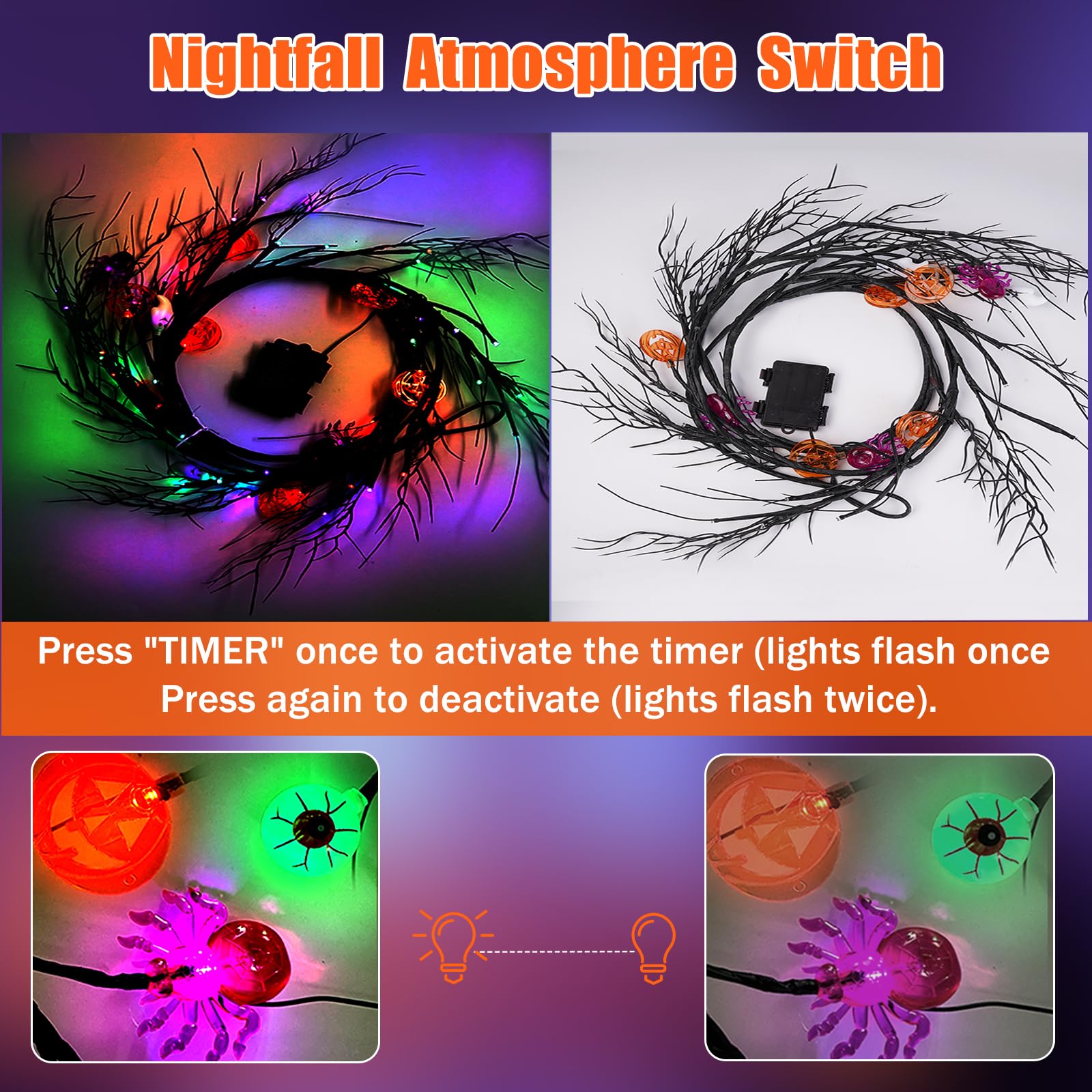 - 🎃 [Spooky Halloween Willow Vine Design]: Elevate your Halloween decor with our 6Ft 54 LED Halloween Lights Up Willow Vine Twig. Featuring a black, flexible vine that allows you to shape it to your desired style, this string light is adorned with a mix of Halloween-themed LED lights, including 3 green spiders, 3 ghosts, 6 pumpkins, and 6 eyeballs. The vibrant green, orange, and purple lights create an eerie ambiance, perfect for any Halloween setting. Transform your living room, wall, or entryway into a haunted masterpiece with this eye-catching decoration.