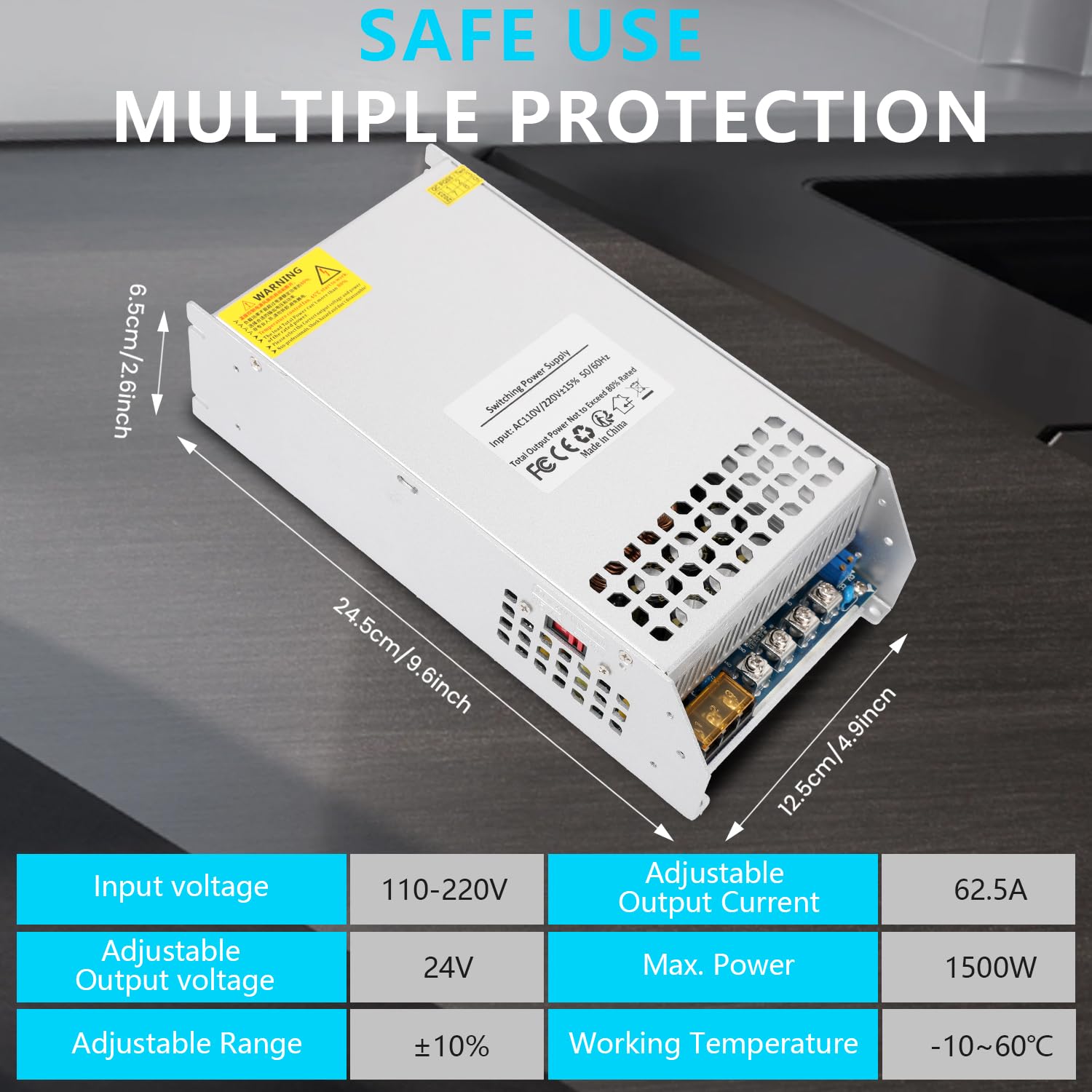 - Upgrade DC 24V Power Supply: Input AC 110V/220V, Output Default 24V, Max 62.5A 1500Watt. It will automatically output 0~62.5A current to match your device, the actual current is depended on the load. power supply has two sets of output channels and can power more 24V devices.