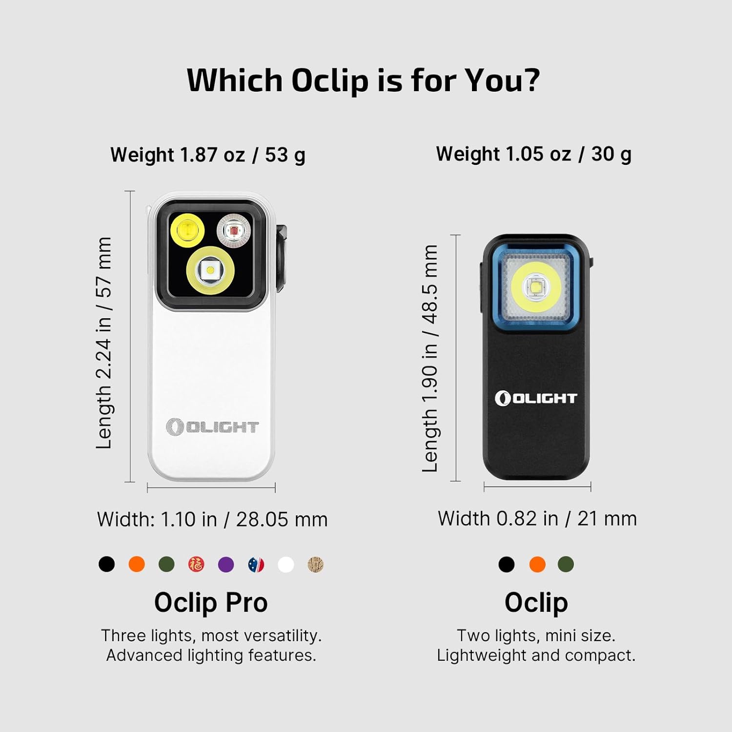 - [EDC Portable Flashlight] Oclip Pro edc light only has 1.87 oz / 53 g weight and 2.24 in / 57 mm length with a max of 500 lumens. Mini flashlight for everyday carry lighting uses