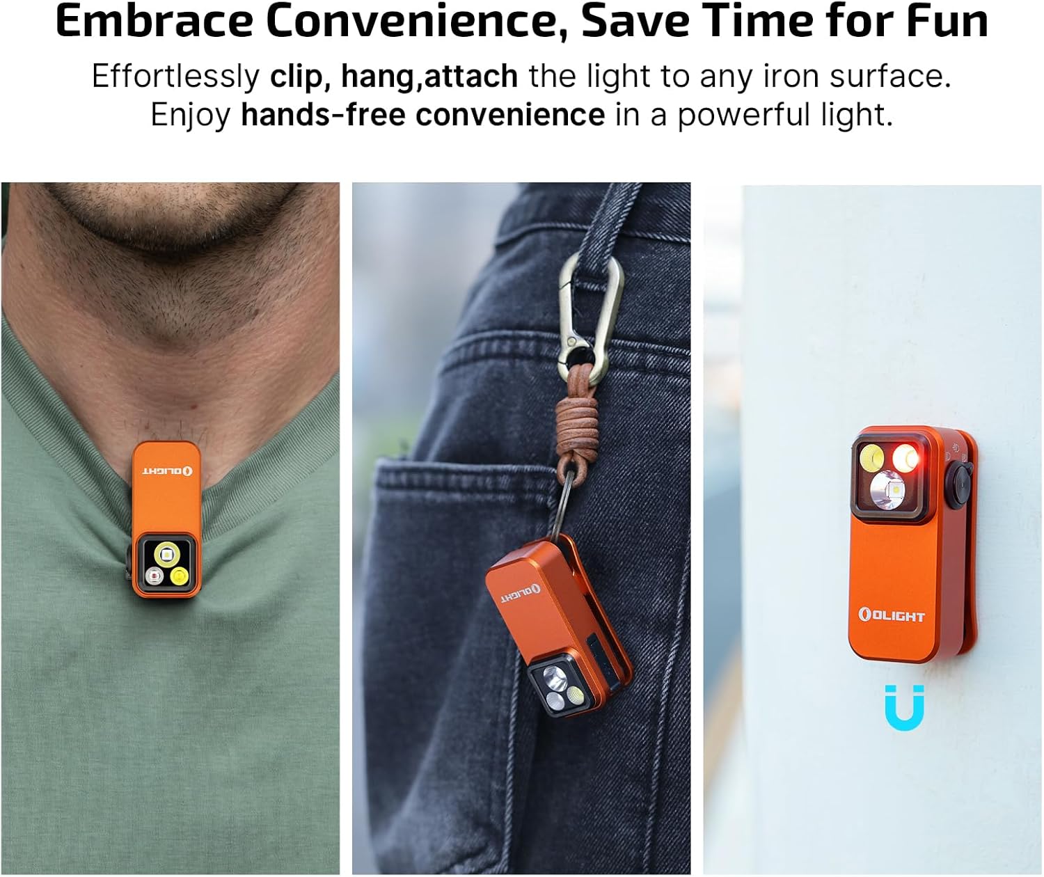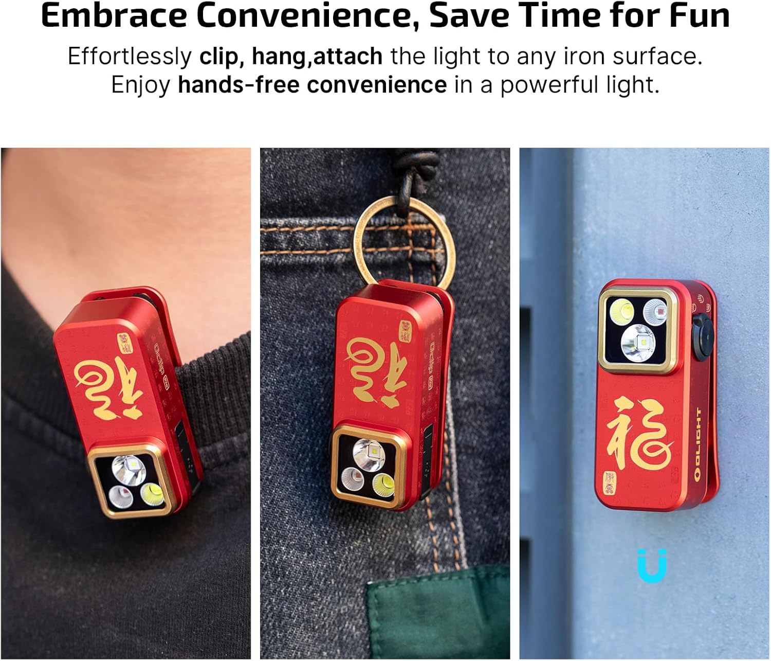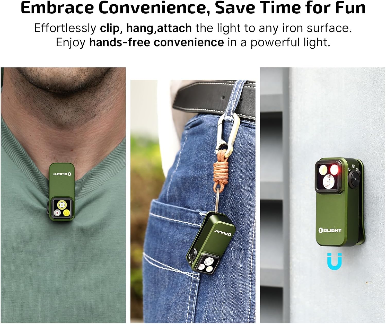 - [Three Lighting Solutions] Olight's first clip-on light featuring a floodlight with 500lm, 120-meter range spotlight, and 40/4lm red light which is designed to meet diverse needs
