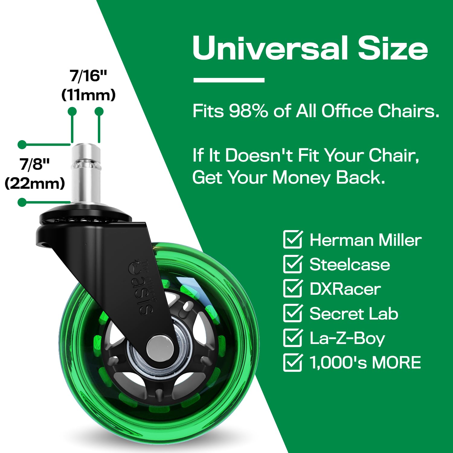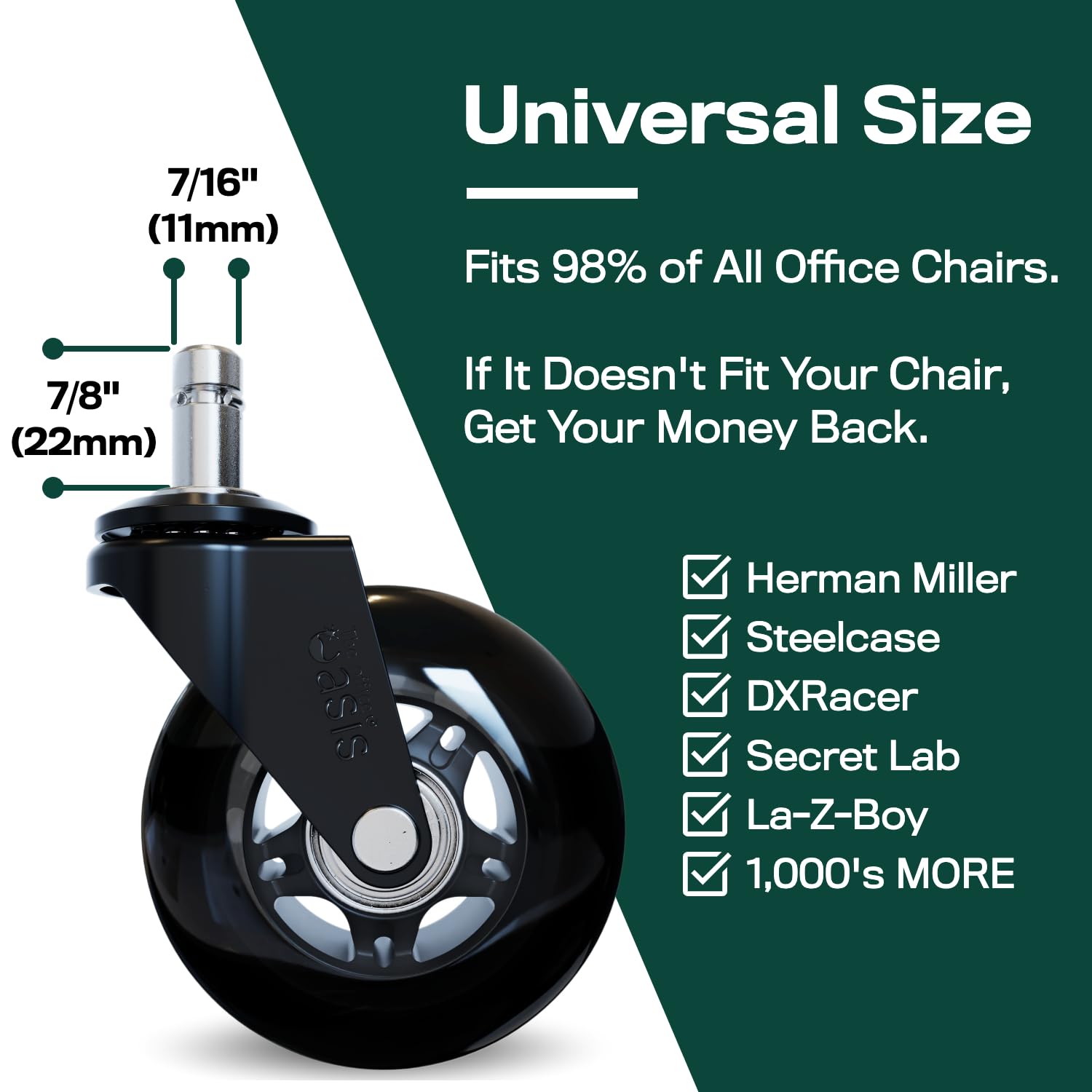 - ★ UNIVERSAL SIZE - Upgrade any rolling office chair with these smooth caster wheels. The universal size stem will fit almost every office chair on the market, except IKEA, for those check out our IKEA Chairs Only size. If for some reason they don’t fit your specific chair, we’ll gladly take care of you.