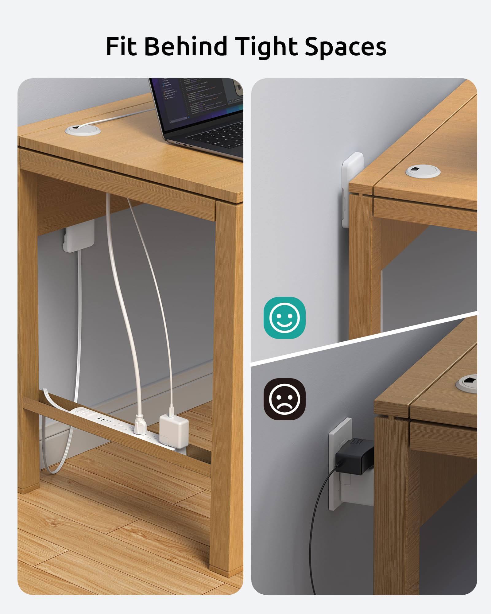 - Space-Saving & Mountable Power Strip: Unique vertical outlet alignment creates parallel cable routing, all plugs exit horizontally along walls/furniture edges, not bulky upward protrusion. Slim profile directional wiring prevent tripping hazards in narrow gaps between beds/sofa & walls. Easily to mounted behind floating shelves or under desks to maximize workspace efficiency
