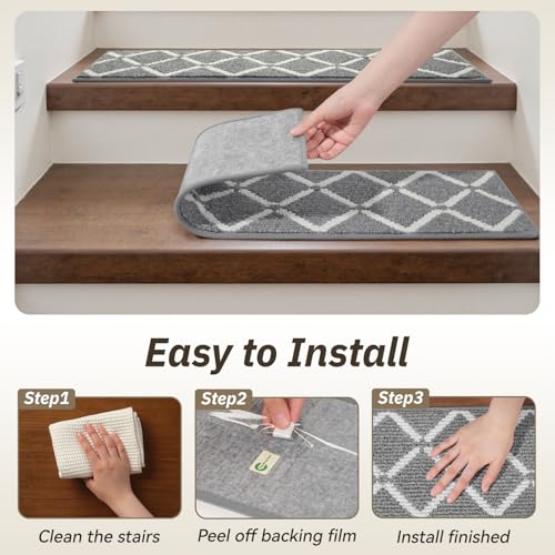 - [Easy Installation & Residue Free] Our carpet stair treads are made for quick, tool-free installation, which can be finished in minutes. Just clean the stairs and keep them dry, peel off the backing film, stick the stair runner onto clean stairs, and press to secure. Removing these stair rugs is also easy and effortless, no glue residue or floor damage.