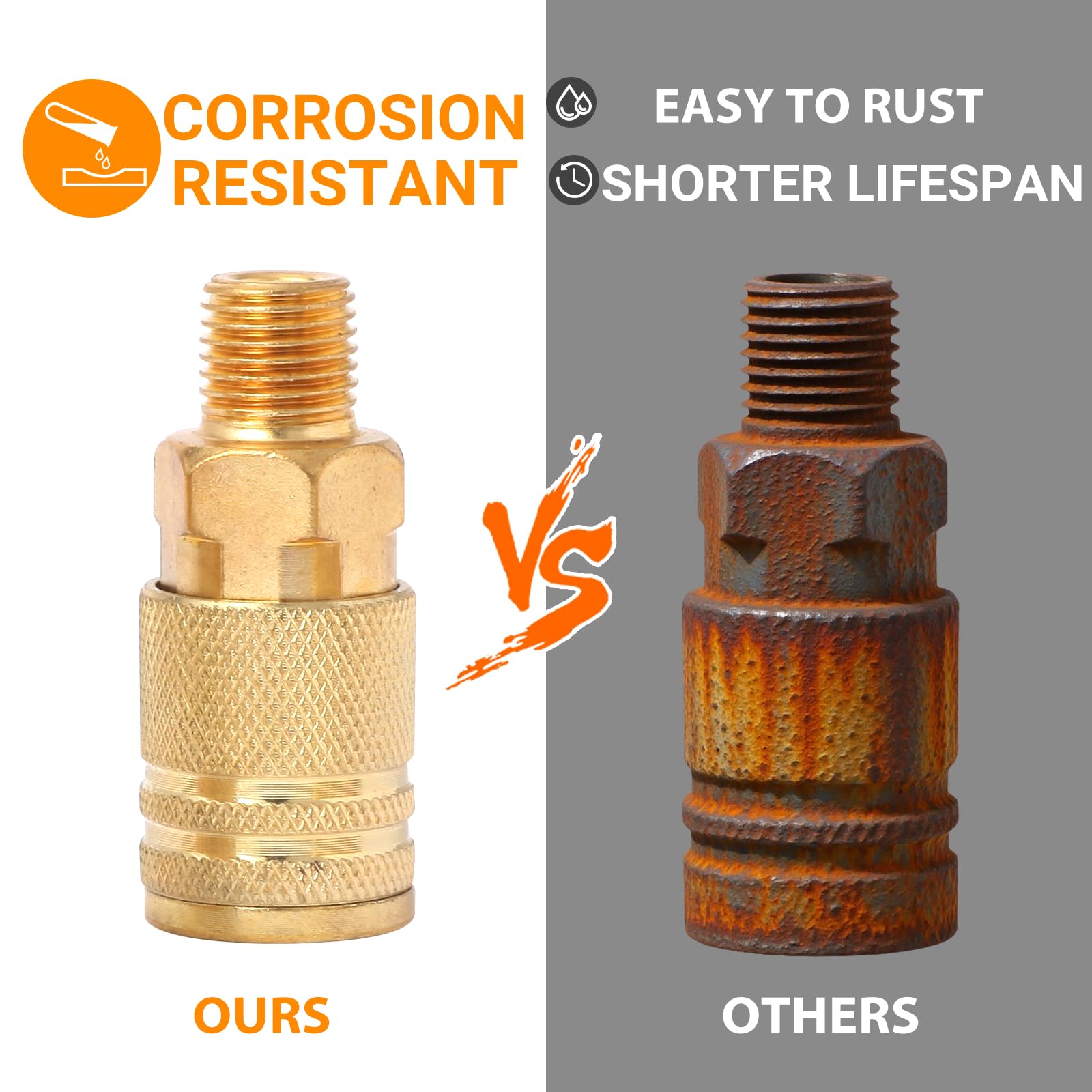 - 【PREMIUM MATERIAL】The quick connect we offer are constructed from iron, except for the brass-made hex coupler and nipple. A copper plating is applied to the external surface of the fittings to enhance their corrosion resistance and extend their service life, guaranteeing exceptional reliability and durability in rigorous applications.