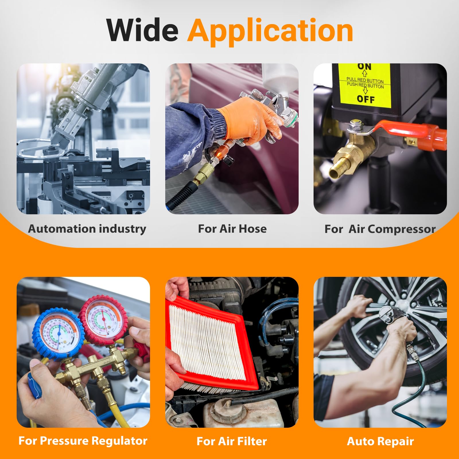 - 【WIDE APPLICATION】 The 1/4" hose fittings and air plugs set we offer finds extensive use across professional work environments, auto shops, dealership service areas, and home garages for a variety of applications involving air hoses, compressors, tools, nailers, blow guns, and pressure washers.