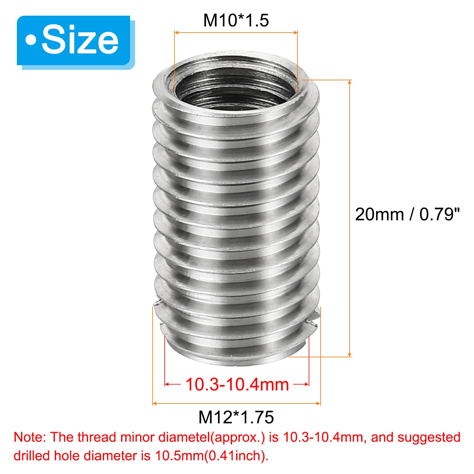 - Color: Silver; Material: 303 Stainless Steel; Female Thread Size: M10*1.5; Male Thread Size: M12*1.75; Bottom Hole Dia.: 10.5mm / 0.41 inch; Length: 20mm / 0.79 inch; Packing List: 6 Pack x Insert Nut
