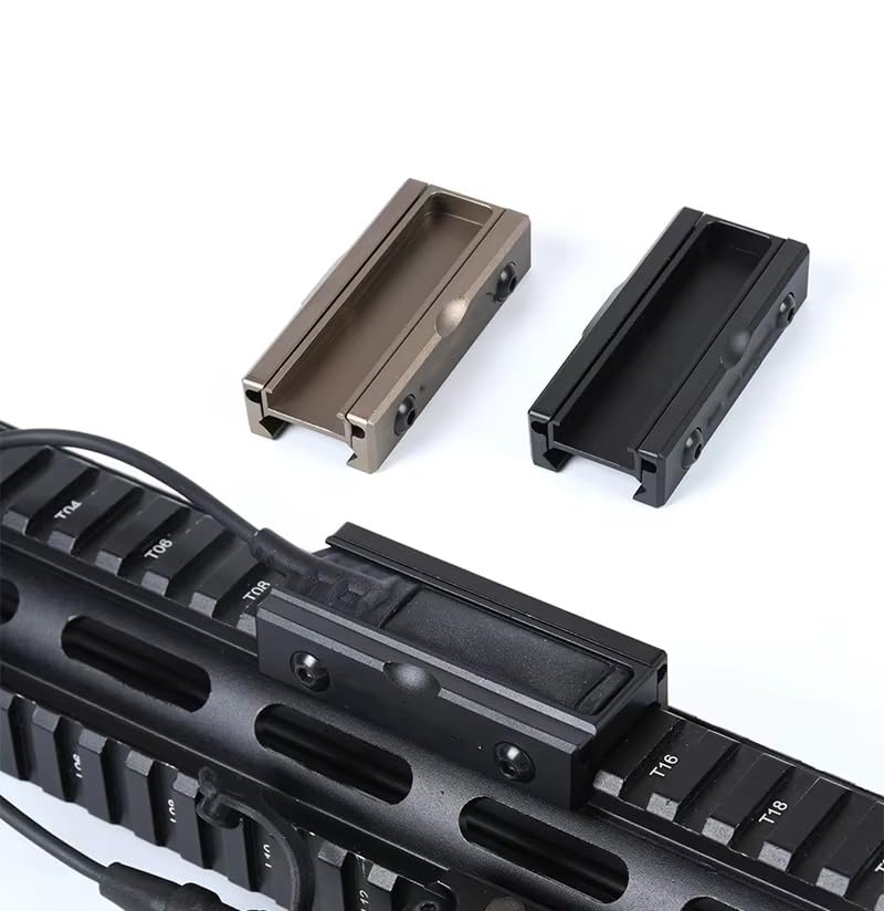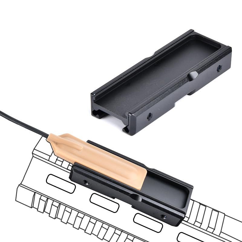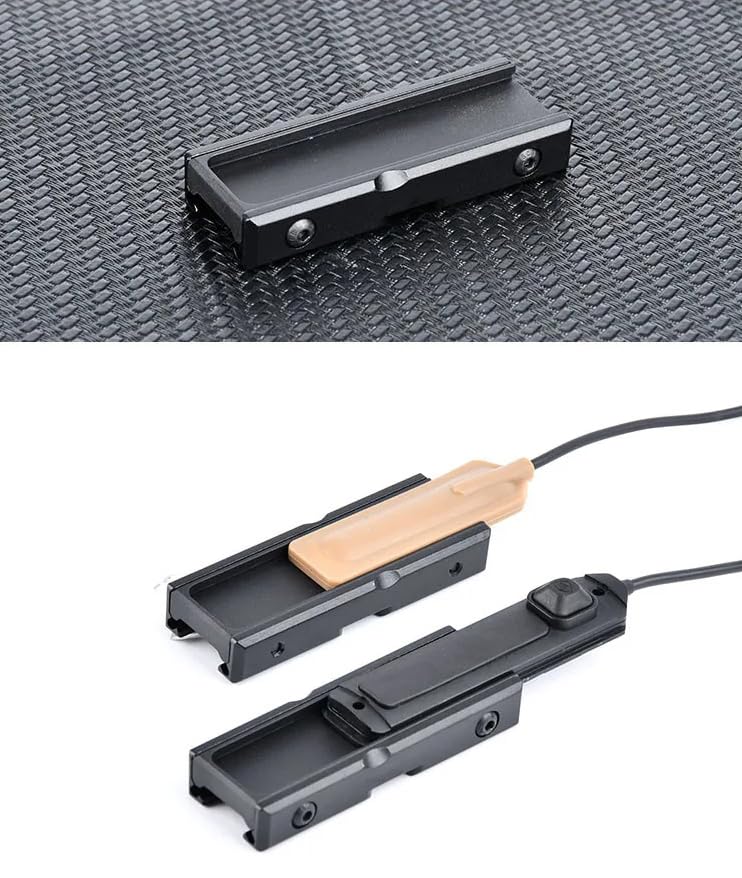 Details: PEQ wire control pressure pad switch.Made of high-quality aluminum alloy , STRONG AND DURABLE, Easy To Install , the laser wire control pressure pad switch mount has fit for the tape switch, staying firmly in place. and can maintain a long service life even in harsh environments fit 20mm Picatinny Weaver Rail