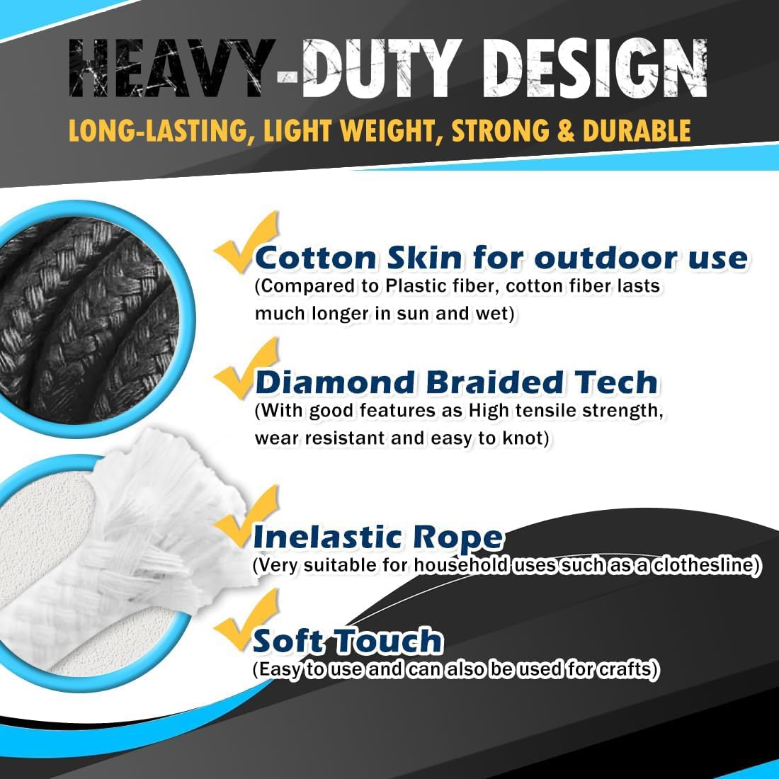 【DIAMOND BRAIDED】Diamond Braid general purpose Rope provides excellent maneuverability and is evenly stressed for higher weight capacity and durability.