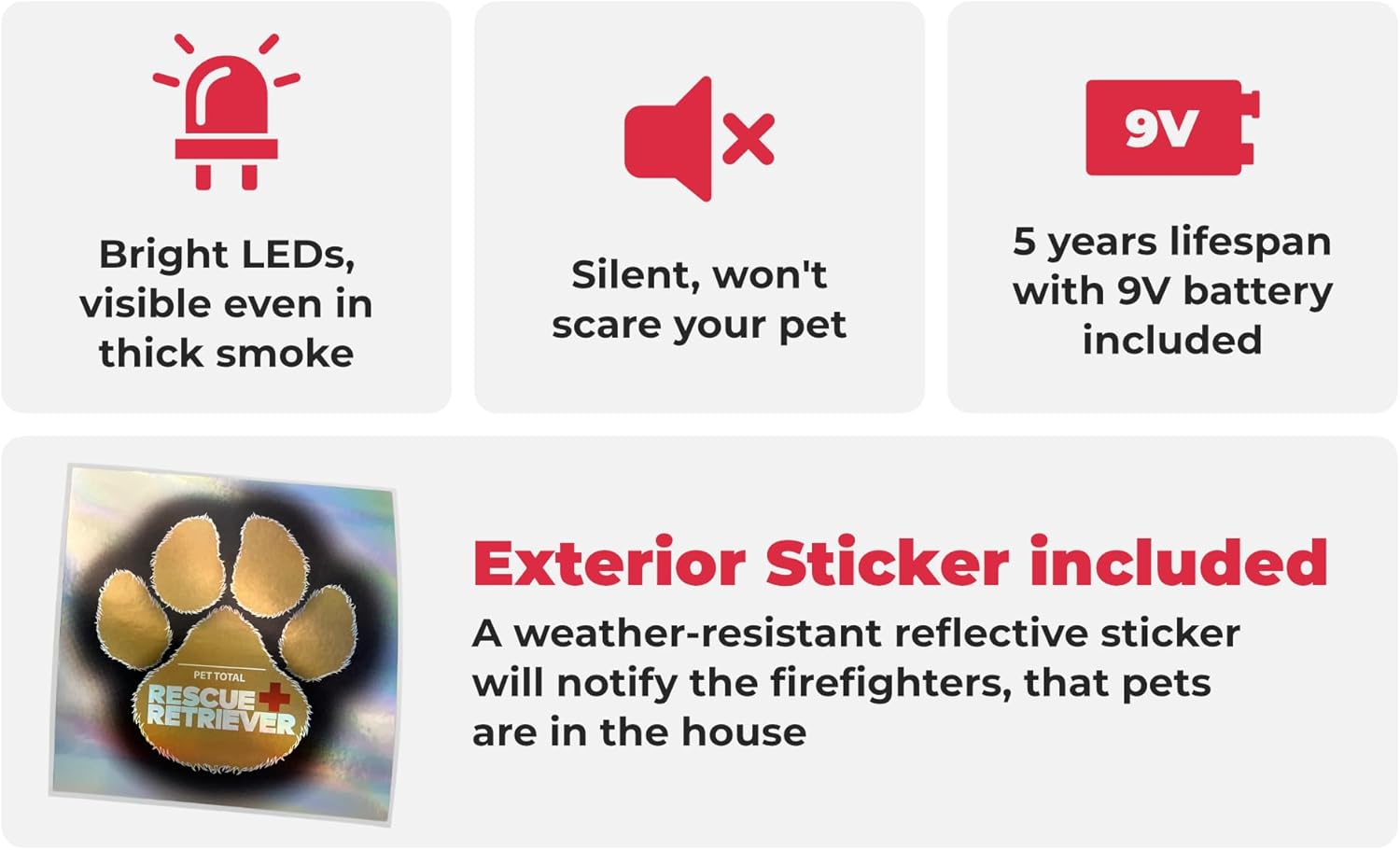 - - Strobing feature alerts firefighters a pet is in the home and where to search first for pet rescue.
