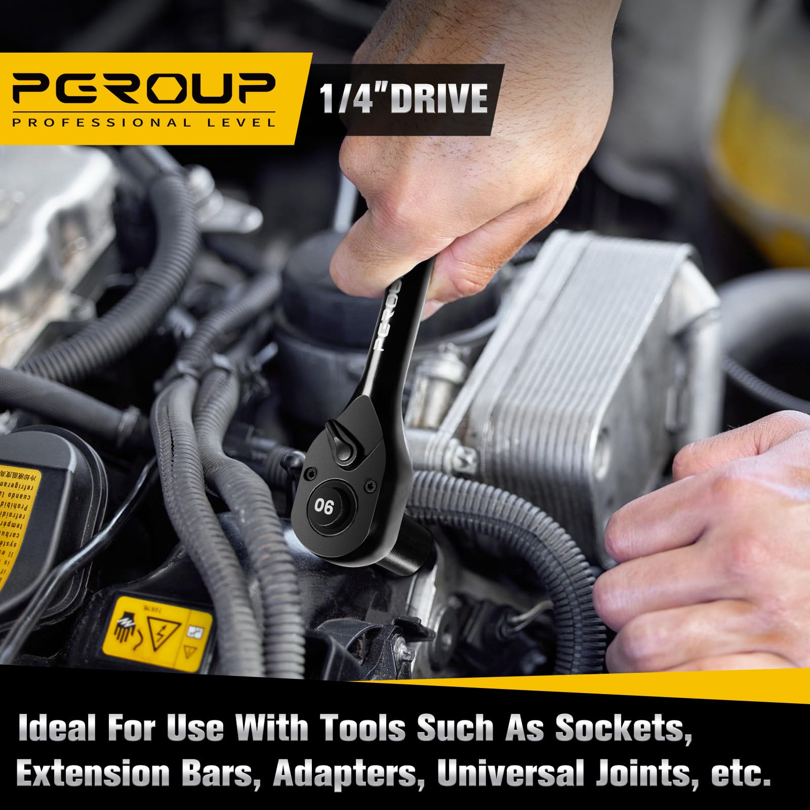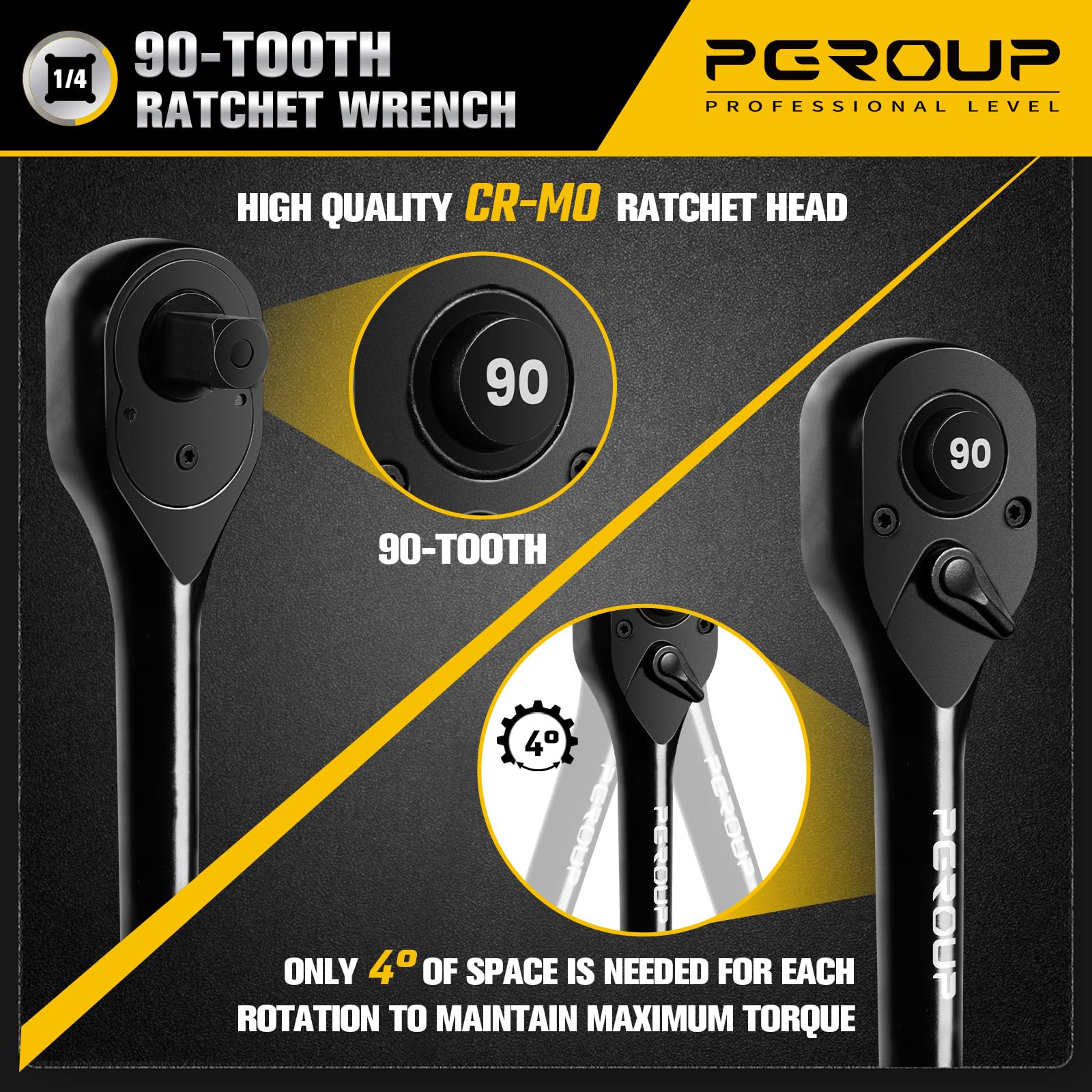 pgroup 1/4-Inch Drive Ratchet Wrench, 90 Tooth Reversible Ratchet, 4-Degree Swing, Ergonomic Handle, Chrome Alloy Made, Quick Release Ratchet Wrench for Repairing, Home, DIY