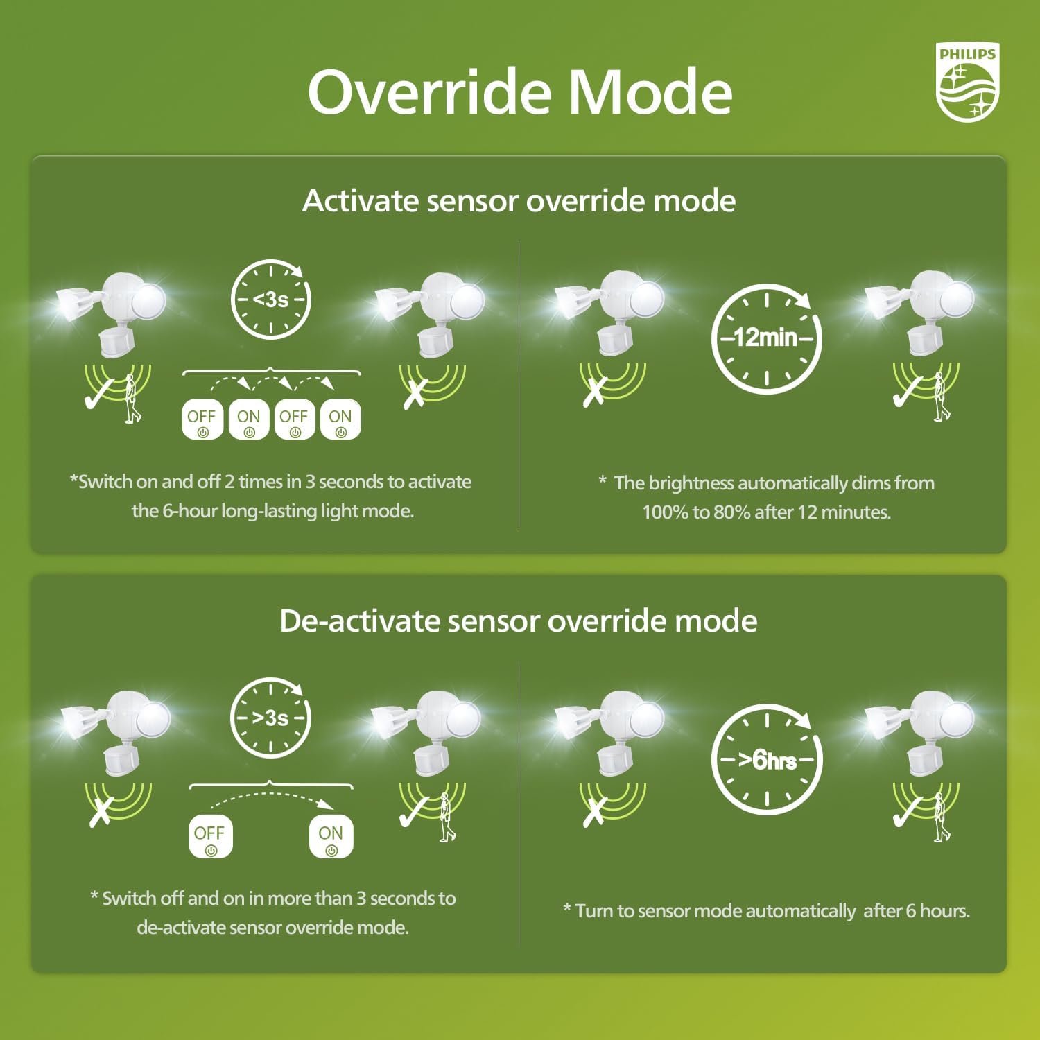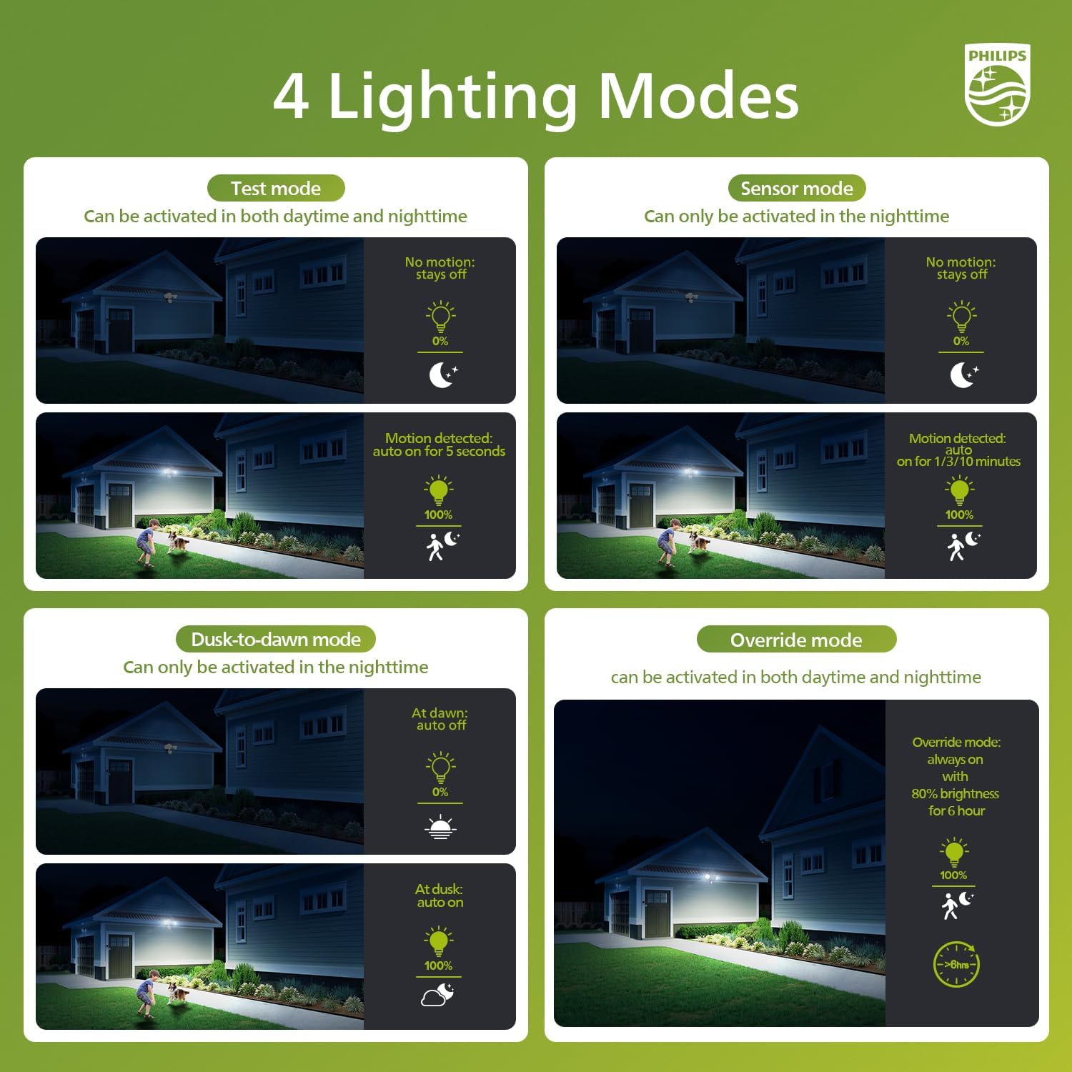 - HIGH-SENSITIVITY SENSOR AND 4 LIGHTING MODES - The PIR sensor on our light can detect ambient motion with a 0-69ft sensing range and 180° induction angle, while lighting time can also be set for 1-10 minutes. The light can activate 4 lighting modes: test mode, security mode, dusk to dawn mode and manual override mode (alwasy-on 80% brightness for max 6 hours).