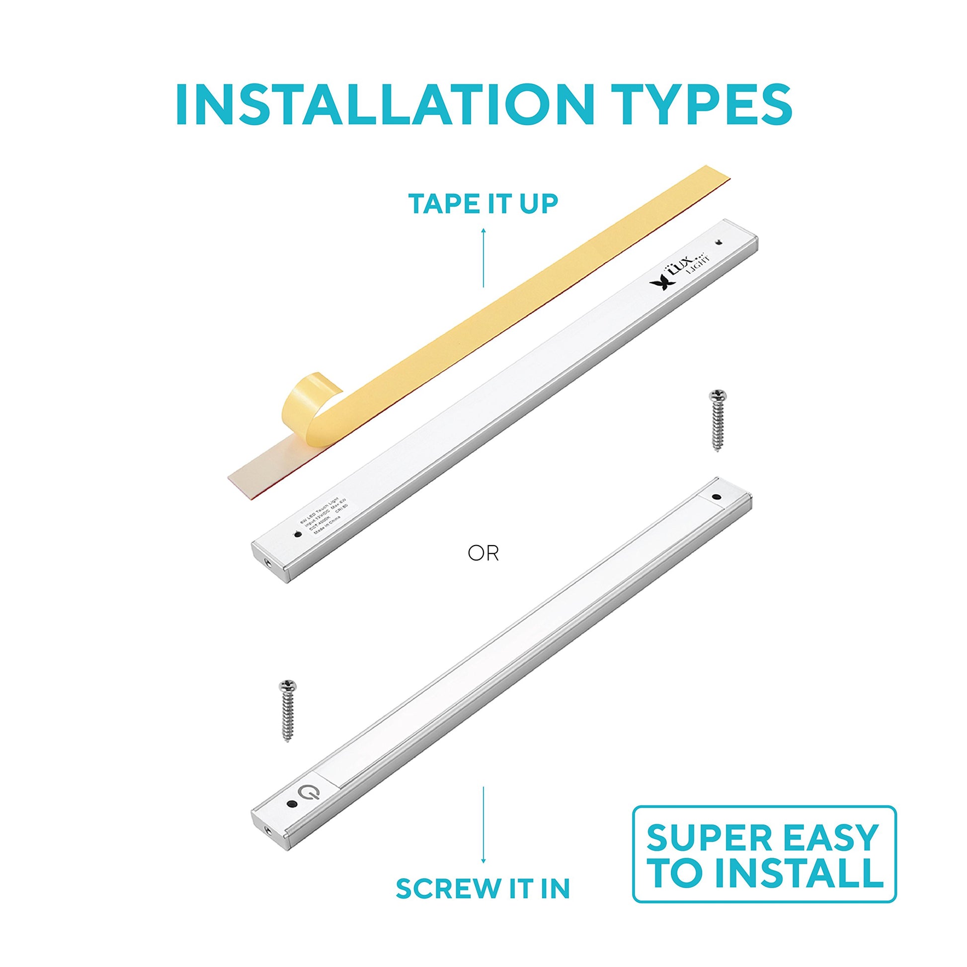- SUPER EASY TO MOUNT. Screw it in or tape it up: use two screws or double sided sticky mounting strip to install your LED under cabinet lighting fixture. Plug it in, turn it on and you are good to go! This low cost nonpermanent solution is easy to dismount and take with you when you move. Purchase these under cabinet lights today while stocks last by clicking "Add to Cart" above.