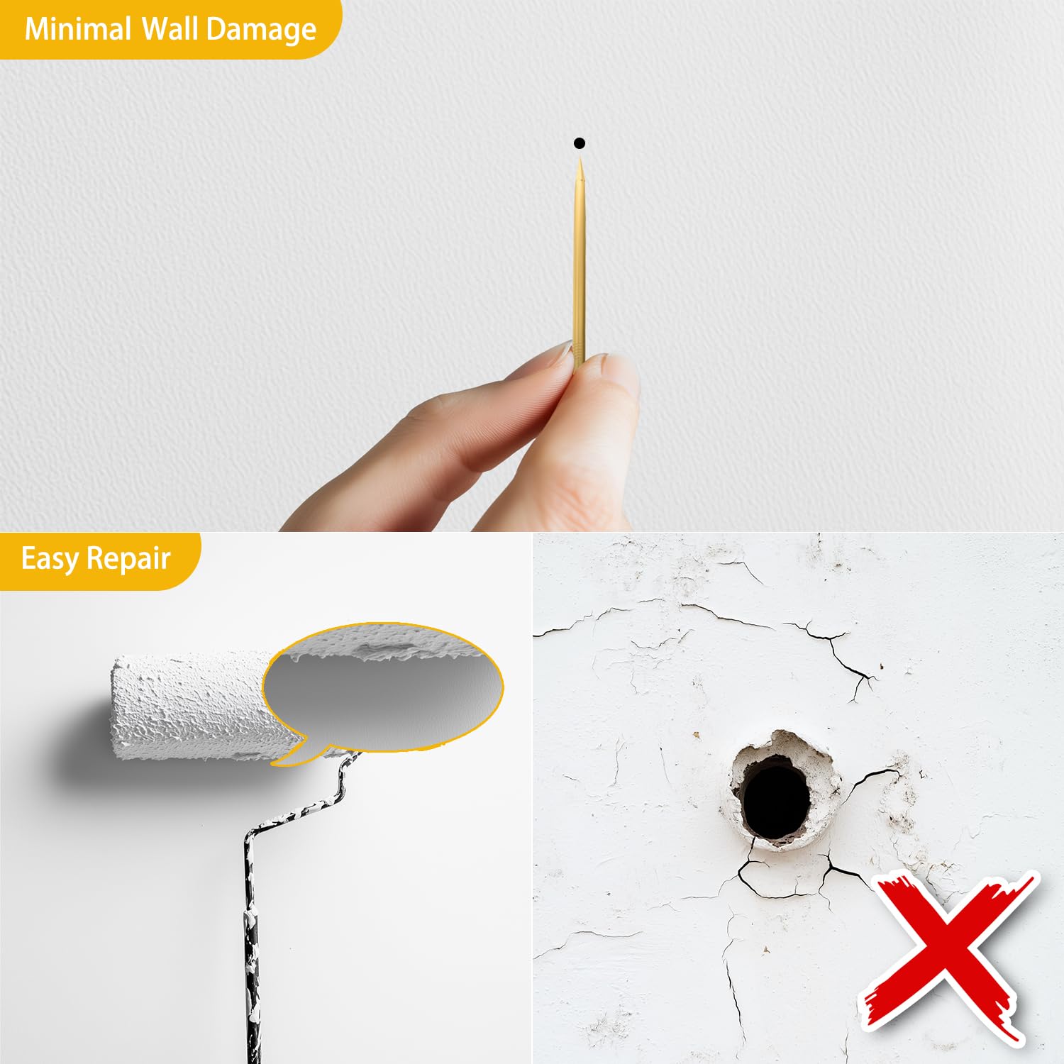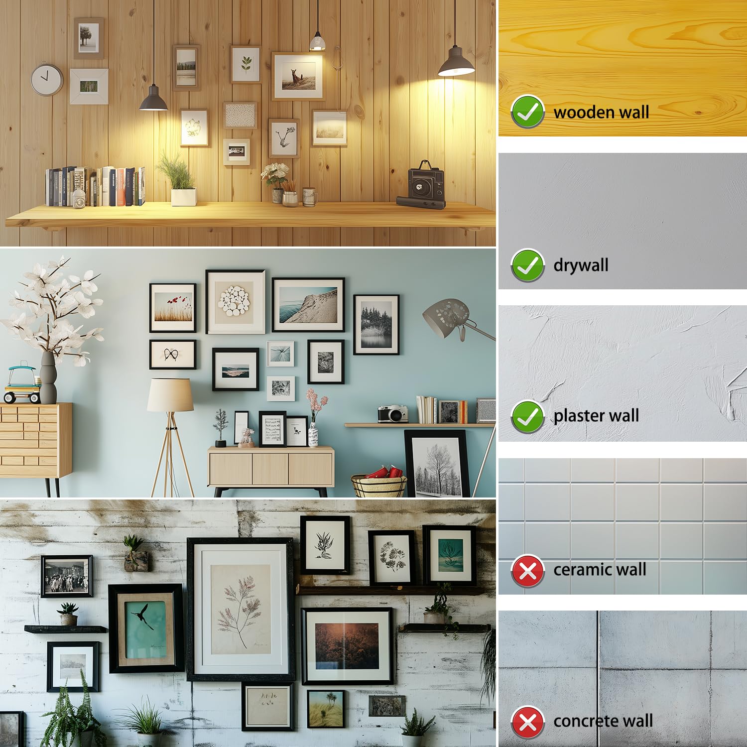 - [Minimal Wall Impact]: Unlike screw-in wall anchors, these picture hangers leave minimal marks on your wall when removed, and the small marks can be easily covered, ensuring your drywall or plaster remains virtually unharmed.