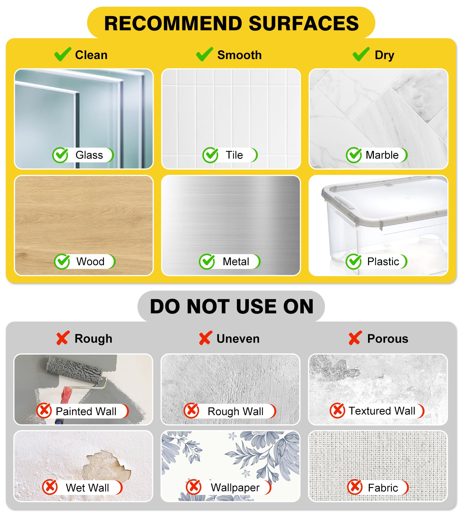 - Fits Clean/Smooth Surfaces: Large hanging strips works on Smooth/Clean/Dry surfaces (Wait at least 7 days after painting before use.), such as finished wood, tile, glass, metal, plastic. Not for wallpaper, porous, rough walls, textured walls, or wet areas. Please note that temperature changes may affect adhesion strength. Recommended temperature range for use: 50°F to 105°F.