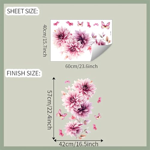 Pink Dahlia Flower Butterfly Wall Stickers, Daisy Peony Floral Art Wall Decals Removable Vinyl Peel and Stick Bathroom Living Room Bedroom Furniture Door Home Decorations