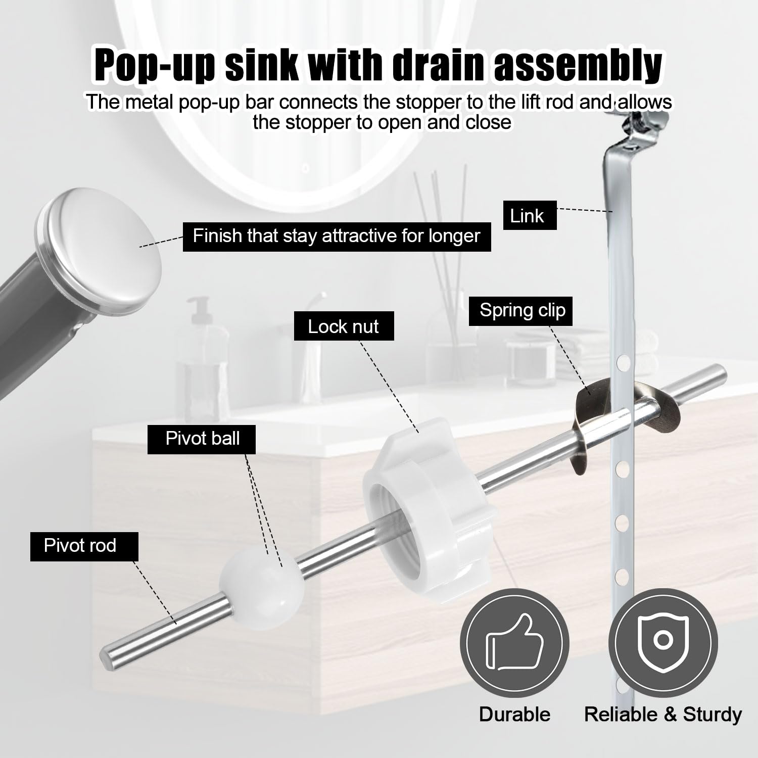 - Material: our sink drain plug and sink pop-up stop pivot arm is made of quality metal and plastic materials, strong, use chrome finish that provides long-lasting durability.