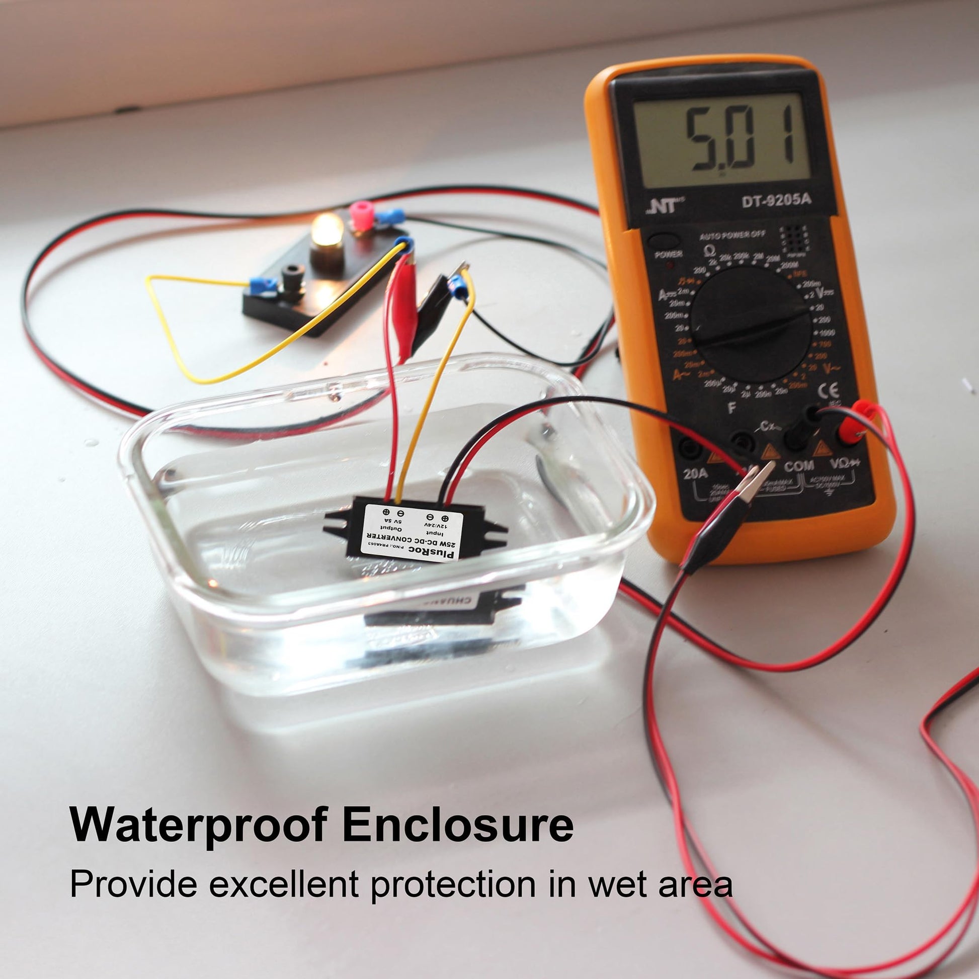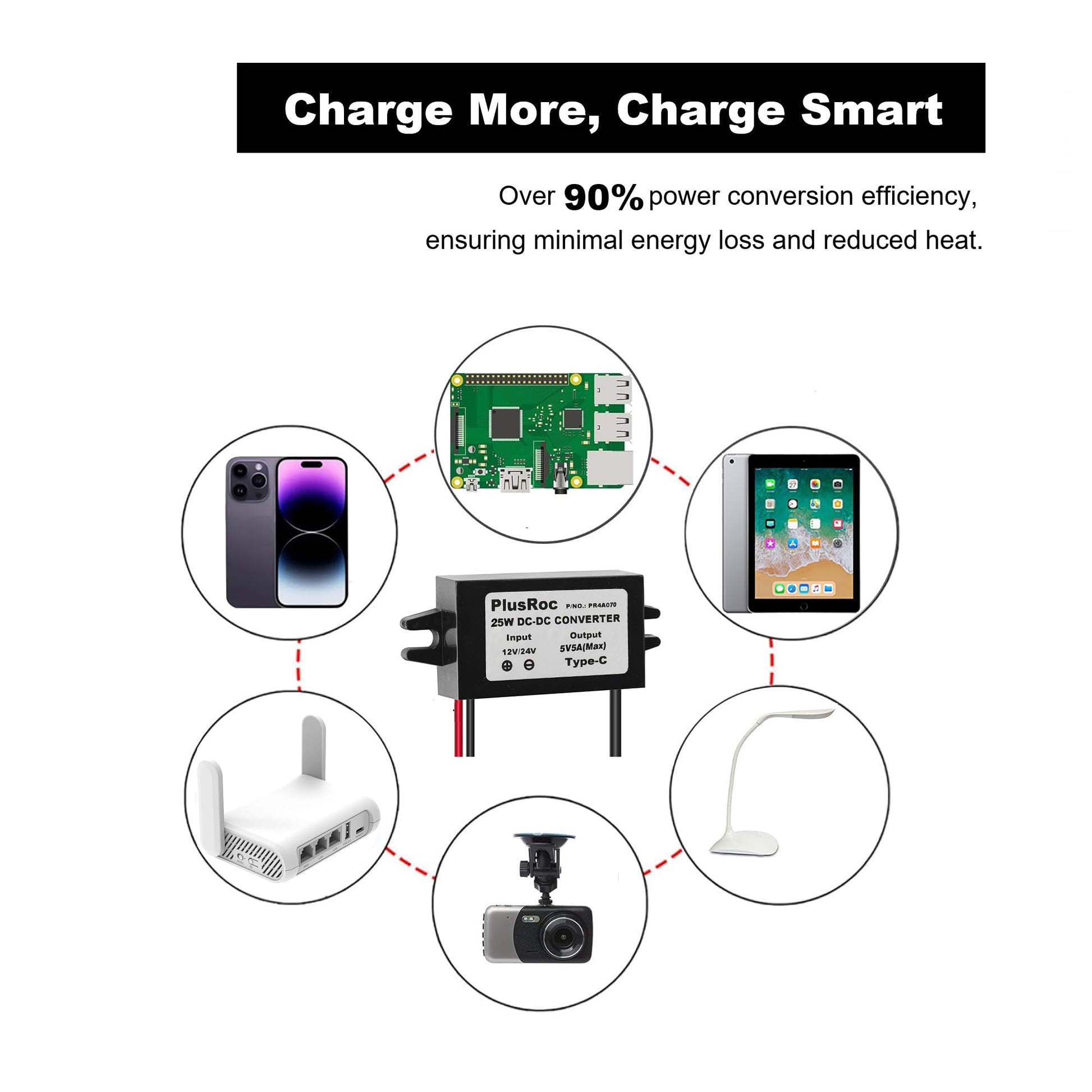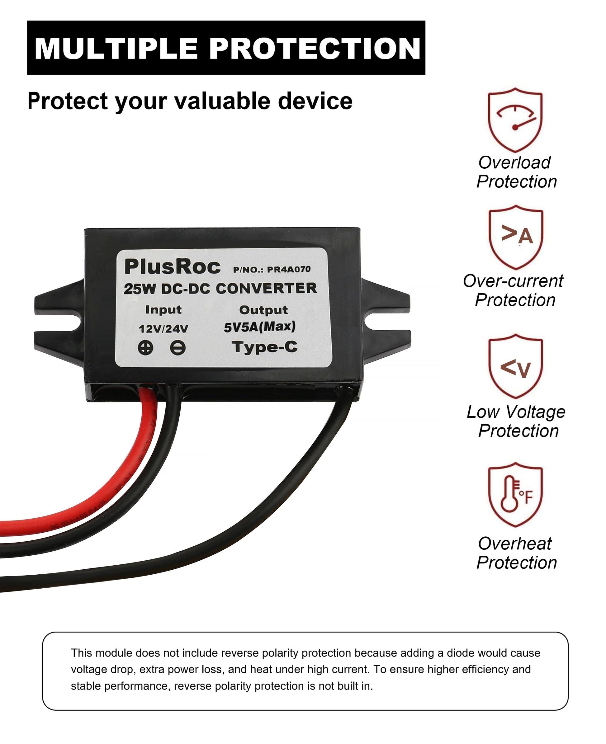 PlusRoc Waterproof DC 12V/24V to 5V 5A Step Down Converter, 25W USB-C Power Adapter for Raspberry Pi 5, Pi 4, Cellphone, and More (1-Pack)
