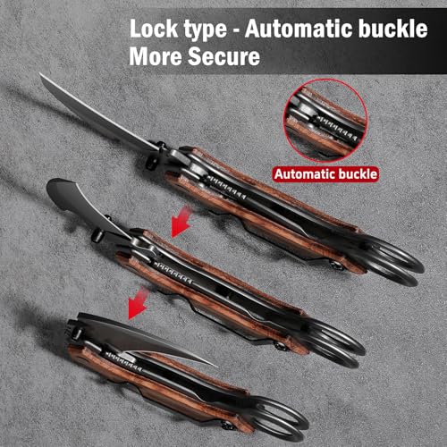 - FEATURES:Folding knife made of high quality and durable stainless steel, handle material is wood, locking - liner lock, pocket clip optional. Firm grip and precise control while the curved blade is ideal for a variety of cutting tasks.