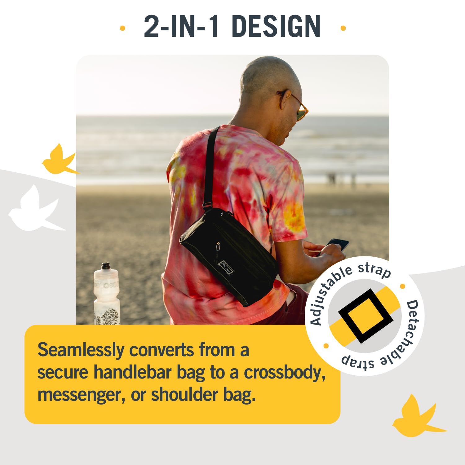 - STYLISH AND VERSATILE – Durable enough for a rough bike commute and fashionable enough for the office, the Domino Handlebar Bag has a detachable strap and can wear as a crossbody purse, messenger bag or shoulder bag for men, women, all adults.