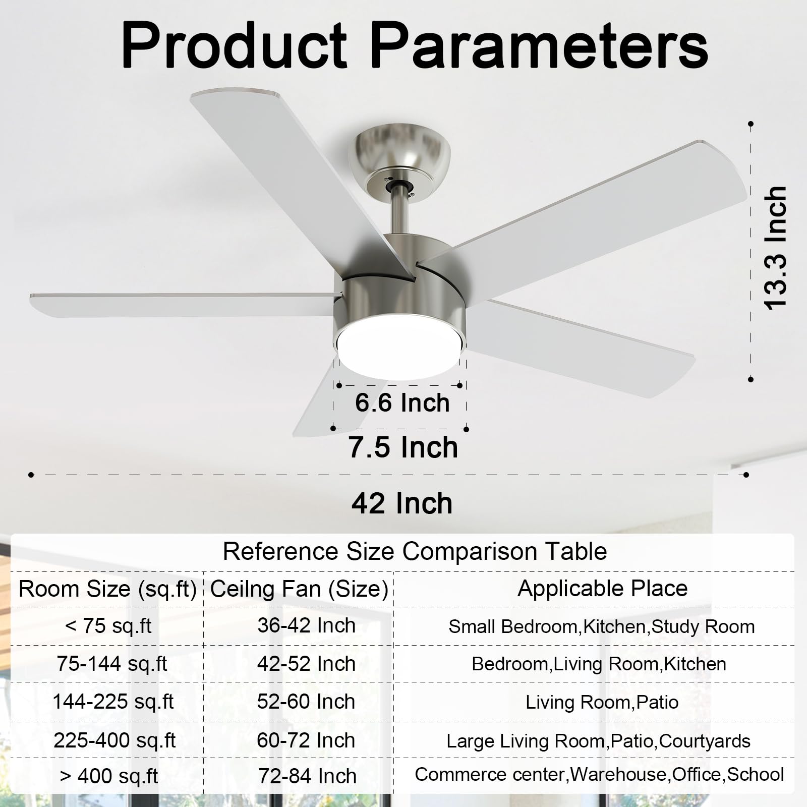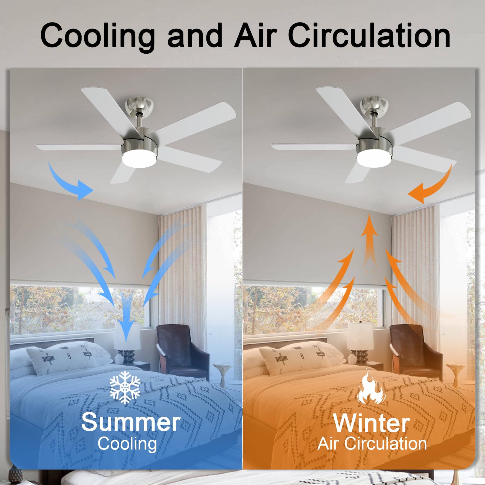 - One-Touch Reverse Function: Equipped with a reversible function, this 42 inch ceiling fan can be effortlessly switched between modes using a remote control. During summer, it operates in downdraft mode, boasting an impressive airflow of over 4800 CFM to keep you cool and alleviate the summer heat. In winter, it switches to updraft mode, effectively rotating and circulating warm air throughout the room. Perfect for year-round comfort and energy efficiency