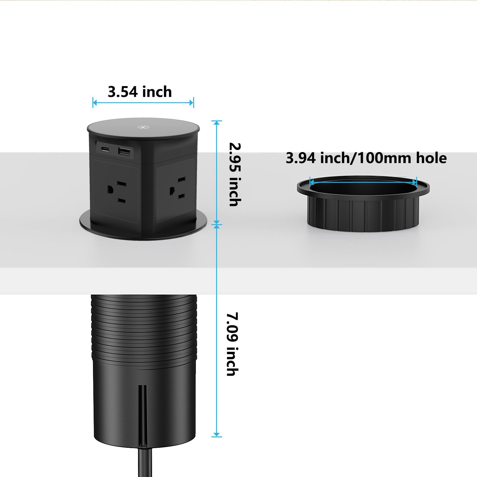 - 4:Easy Installation-Cut a 3.94 inch (100mm) hole, remove the ring and slide the countertop pop up outlet body from top, tighten up the ring from bottom. Easy to set up in your home, kitchen, office, conference room and so on.