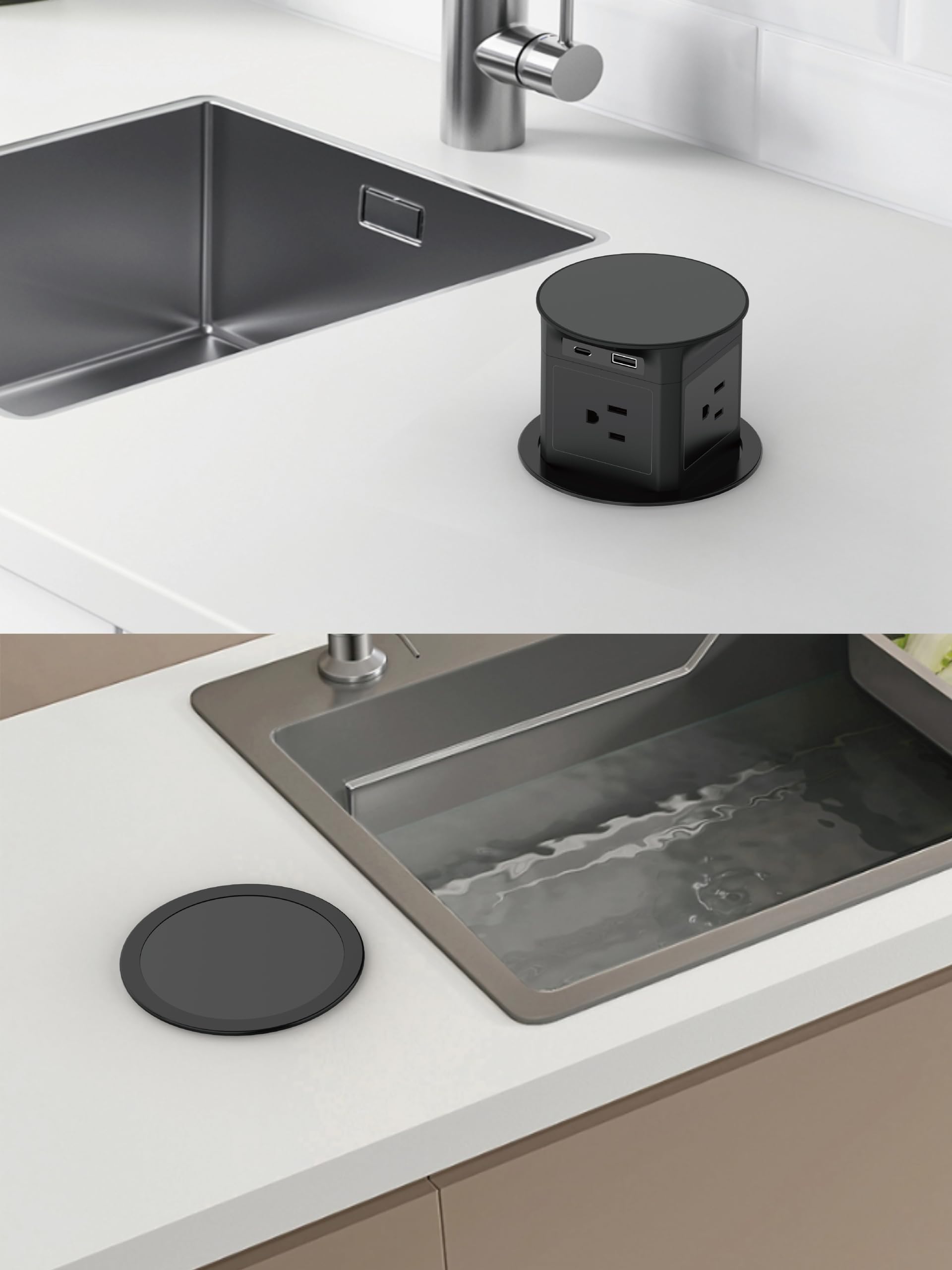 - 5:Space-Saving Design-This pop-up outlet discreetly mounts into your countertop, minimizing clutter and maximizing workspace. When not in use, it easily folds down to maintain a clean and seamless look.