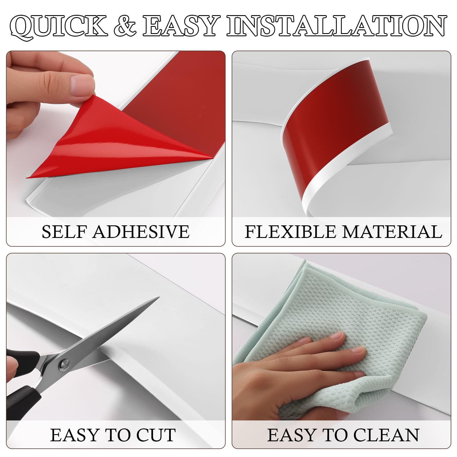 - Toe DESIGN: The self-adhesive baseboard trim has a toe design that covers gaps for a neater home. It also prevents dust buildup and the smooth surface makes cleaning and maintenance easier. This unique feature can greatly enhance the comfort and elegance of your home.