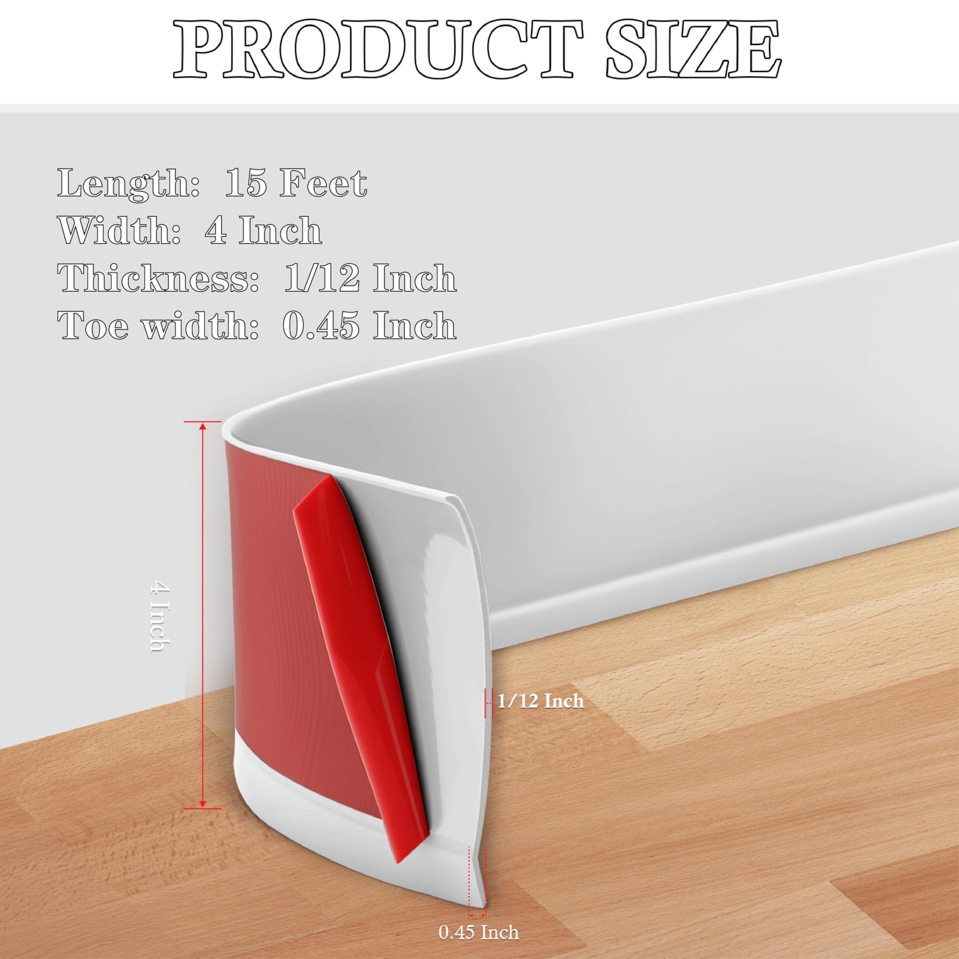 - PREMIUM MATERIAL: 1/12 Inch (thickness) x 4 Inch (width) x 15 Feet (length) Flexible baseboard molding trim made of high quality vinyl material, the self adhesive vinyl wall base with simple design is flexible and durable. Suitable for kitchen, bathroom, living room, garage and other indoor and outdoor decoration.